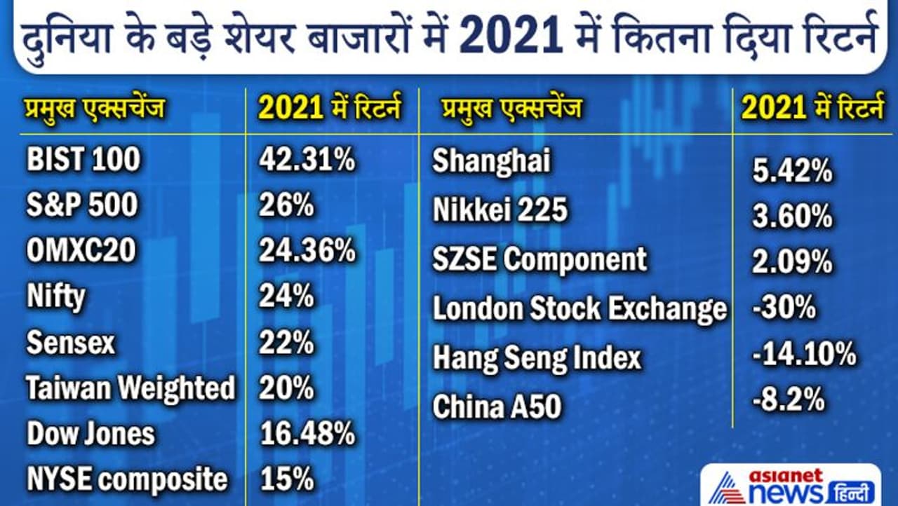 बिजनेस डेस्क। वर्ष 2021 दुनियाभर के शेयर बाजारों (Global Share Market) के लिए उतना बेहतर नहीं रहा, जितना वर्ष 2020 रहा था। इस साल दुनिया का कोई भी एक्सचेंज 50 फीसदी का रिटर्न निवेशकों को नहीं दे सका। अगर बात भारत की करें तो दोनों एक्सचेंज 25 फीसदी से कम का रिटर्न देखने को मिला है। उसके बाद भी दुनियाभर के बाजारों के मुकाबले बेहतर स्थिति में रहे। जहां तक लंदन स्टॉक एक्सचेंज (London Stock Exchange) का सवाल है, इस साल नेगेटिव रिटर्न आया है। वहीं अमरीकी बाजार (US Market) भी 20 फीसदी से कम रिटर्न दे सके। ओवरऑल देखा जाए तो भारतीय बाजारों में दबादबा रहा। आइए आपको दुनिया के कौन से बाजार ने निवेशकों को मालामाल किया है।