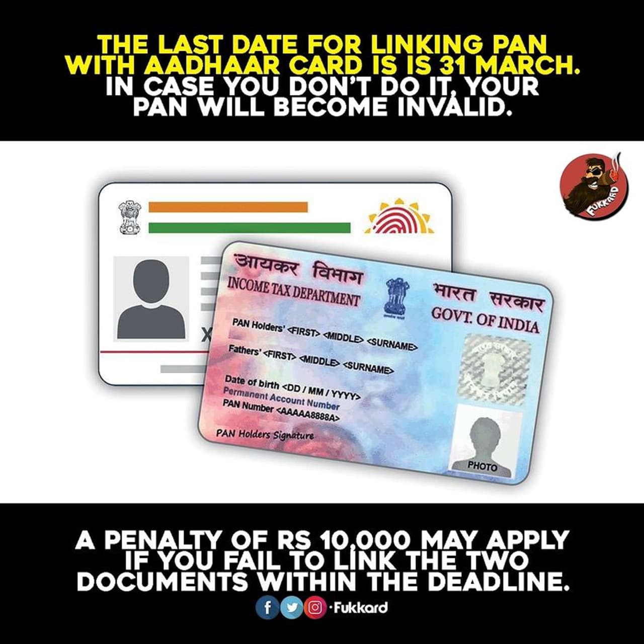 पैन और आधार को लिंक करने की अंतिम तिथि 31 मार्च है, और यदि ऐसा नहीं किया जाता है तो पैन निष्क्रिय कर दिया जाएगा और निर्धारिती पर 10,000 रुपए तक का जुर्माना लगाया जा सकता है।