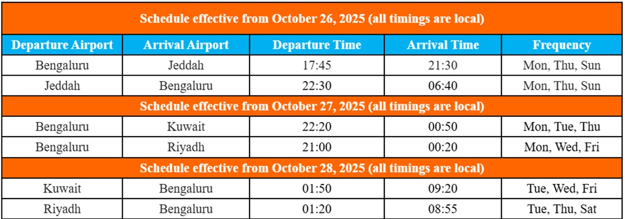 एयर इंडिया एक्सप्रेस ने जेद्दा, रियाद और कुवैत के लिए बेंगलुरु से सीधी विमान सेवा शुरू की है। टिकट की कीमत 13500 से शुरू होगी। जेद्दा के लिए फ्लाइट 26 अक्टूबर 2025 से और रियाद व कुवैत के लिए 27 अक्टूबर 2025 से शुरू होगी।