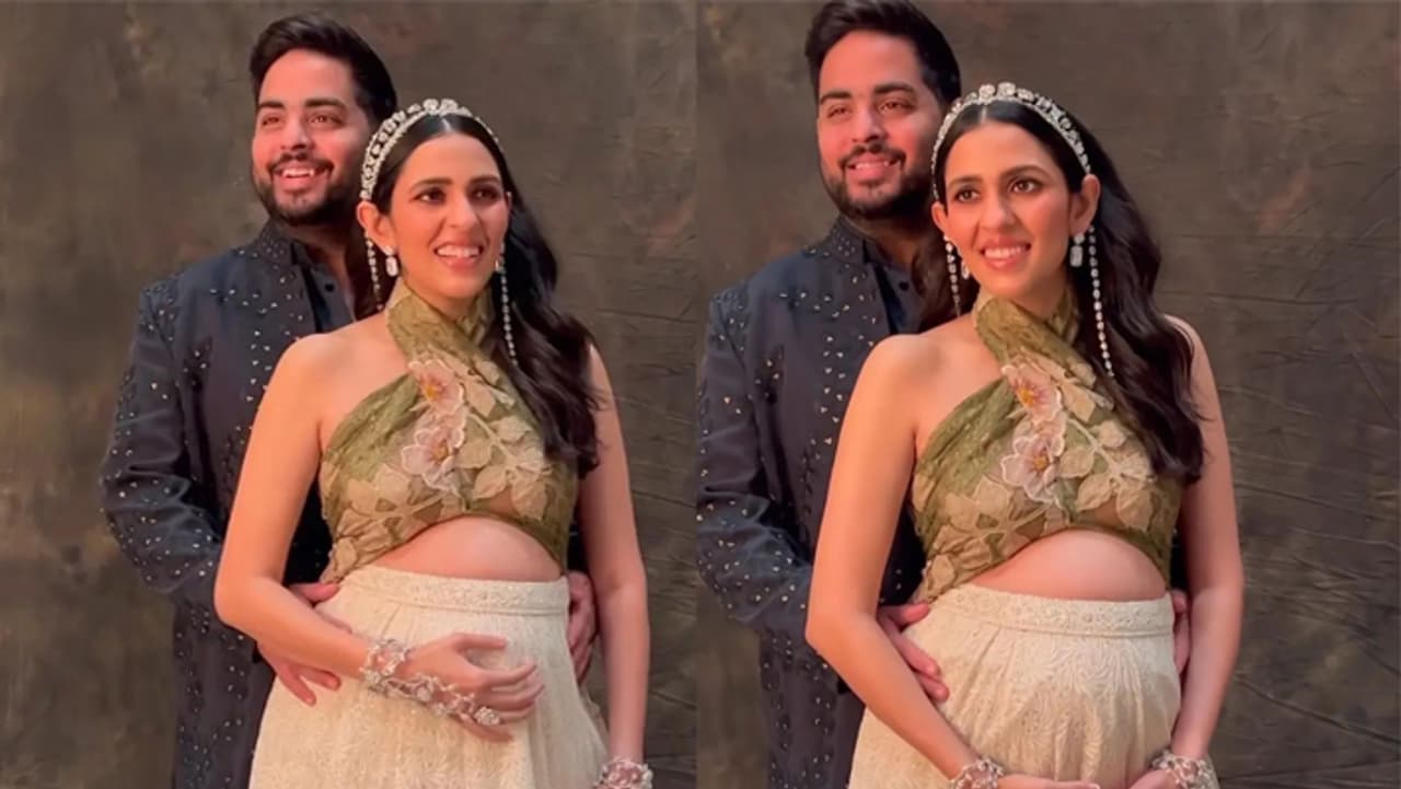 आकाश अंबानी पत्नी श्लोका मेहता के बेबी बंप पर हाथ रख फोटो खिंचाते नजर आए। इस दौरान दोनों ने कई पोज दिए।