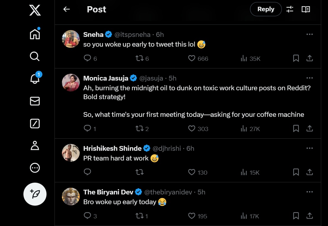 पोस्ट के वायरल होने के बाद आदित ने एक एक्स पोस्ट में कहा, "मुझे काम और जीवन में संतुलन से कोई आपत्ति नहीं है। मैं अपने सभी प्रतिस्पर्धियों को इसे अपनाने की सलाह देता हूं।" इसके बाद X पर नई बहस शुरू हो गई। लोगों ने जेप्टो के वर्क कल्चर को लेकर अपने विचार शेयर किए हैं।