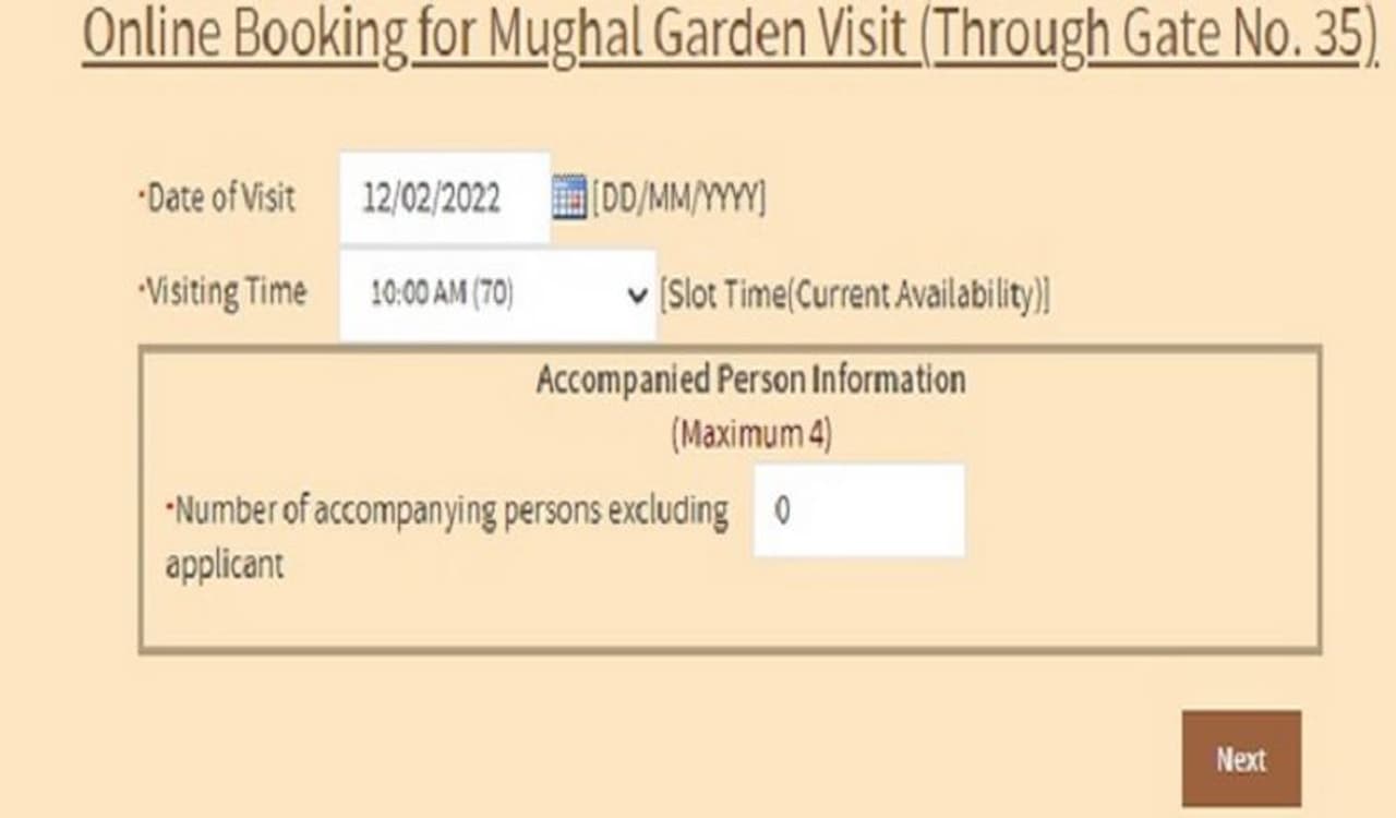 - विज़िट की तिथि, विज़िटिंग समय, और साथ में व्यक्ति की जानकारी (आवेदक को छोड़कर साथ आने वाले व्यक्तियों की संख्या) चुनें, और फिर अगला पर क्लिक करें
