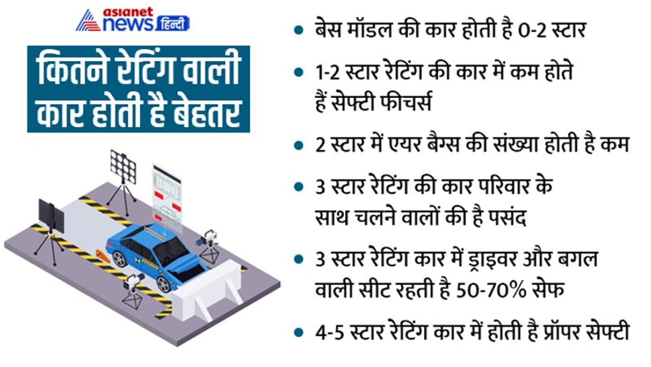 अब आपको बताते हैं कि सेफ्टी रेटिंग कैसे मिलता है। सेफ्टी रेटिंग क्रैश टेस्ट से मिलता है। इसके लिए जिस कार का टेस्ट होना है, उस कार में इंसान जैसी डमी को बिठा दिया जाता है। टेस्ट के दौरान गाड़ी को फिक्स स्पीड से किसी हार्ड ऑब्जेक्ट के साथ टकराया जाता है। इस दौरान कार में 4 से 5 डमी होते हैं। बैक सीट पर बच्चे की डमी भी रखी जाती है। ये चाइल्ड सेफ्टी के मानक का पता लगाता है।