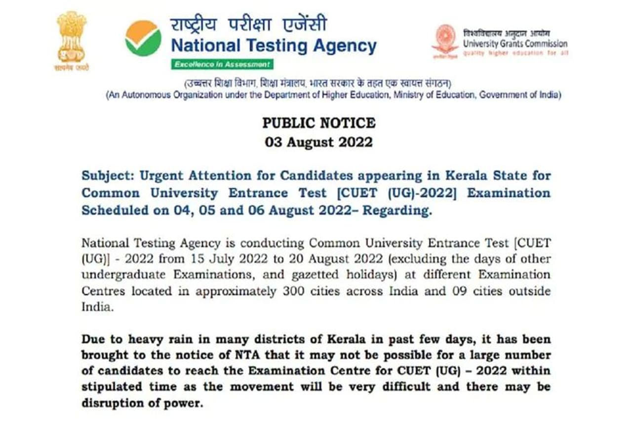 एनटीए की तरफ से जारी आधिकारिक नोटिस में कहा गया है कि, पिछले कुछ दिनों में केरल के कई जिलों में भारी बारिश हो रही है। ऐसे में सीयूईटी की परीक्षा में शामिल होने जा रहे बड़ी संख्या में उम्मीदवारों का समय पर परीक्षा केंद्र तक पहुंचना कठिन होगा। एग्जाम सेंटर पर बिजली की समस्या भी आ सकती है।