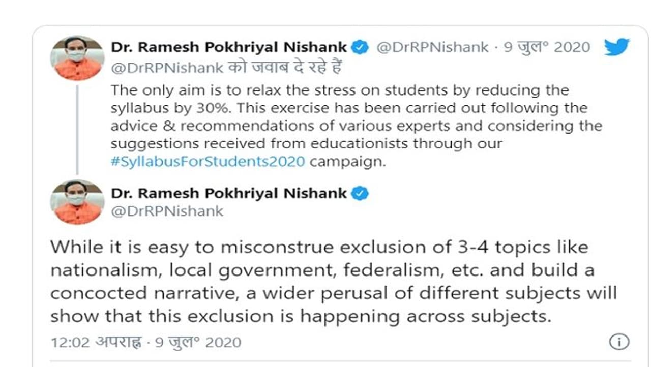 केंद्रीय मानव संसाधन मंत्री रमेश पोखरियाल ‘निशंक’ ने कई ट्वीट किए। उन्होंने लिखा,‘‘सीबीएसई के पाठ्यक्रम में कुछ टॉपिक्स को हटाए जाने के बारे में बहुत सी मनगढंत टिप्पणियां की जा रही हैं। इन टिप्पणियों के साथ समस्या यह है कि वे गलत विमर्श को फैलाने के लिए चुनिंदा विषयों को जोड़कर सनसनीखेज बना रहे हैं।