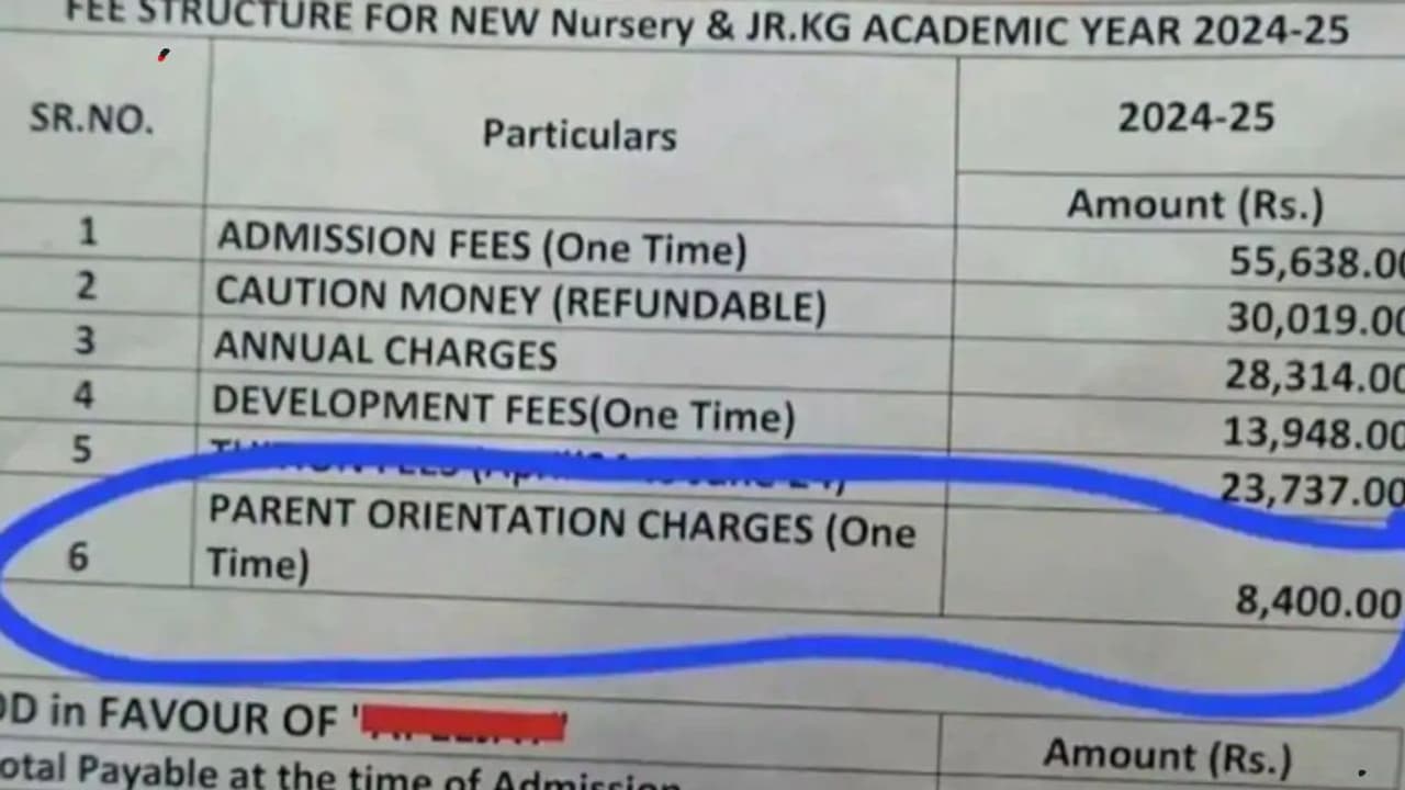 एक नर्सरी स्कूल (Nursery School) की चौंकाने वाली सालाना फीस की तस्वीर वायरल हो रही है। इससे लोगों में काफी गुस्सा है। स्कूल की फीस देखकर कई लोग हैरान हैं। फीस के विवरण में सबसे ज्यादा ध्यान खींचने वाली बात है अभिभावक ओरिएंटेशन फीस (Parent Orientation Fee)। स्कूल अभिभावकों से ओरिएंटेशन के लिए 8,400 रुपये एकमुश्त वसूल रहा है। इन सब को मिलाकर नर्सरी और जूनियर केजी के बच्चों के एडमिशन की फीस 55,600 रुपये हो जाती है।