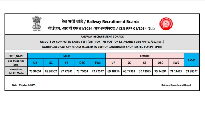 RPF SI Result 2024 Category-wise cut-off marks here