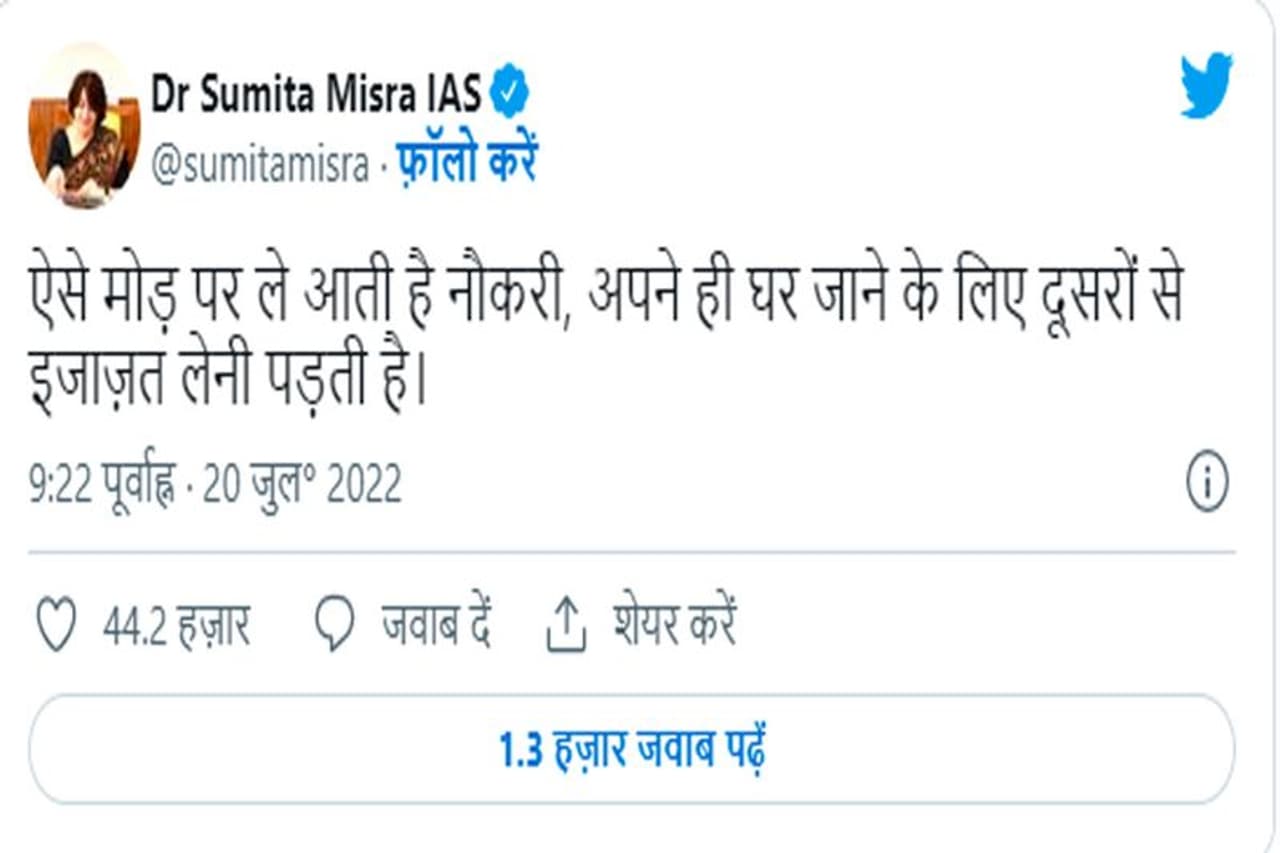 करियर डेस्क : हरियाणा (Haryana) की महिला IAS अफसर सुमिता मिश्रा (Sumita Misra) का एक ट्वीट इन दिनों सोशल मीडिया पर खूब वायरल हो रहा है। ट्विटर पर उन्होंने अपना दर्द बयां करते हुए एक ट्वीट किया, जिस पर यूजर्स ने जमकर चुटकी ली है। गजब-गजब के कमेंट्स किए हैं। अब तक उनके ट्वीट को 40 हजार से ज्यादा लोगों ने लाइक किया है और बड़ी संख्या में लोगों ने कमेट्स भी किए हैं। सुमिता हरियाणा एग्रीकल्चर एंड फार्मस वेलफेयर (Agriculture & Farmers Welfare) की एडिशनल चीफ सेक्रेटरी और हरियाणा पॉल्यूशन कंट्रोल बोर्ड की चेयरमैन भी हैं। उन्होंने ट्वीट कर लिखा है- ऐसे मोड़ पर ले आती है नौकरी, अपने ही घर जाने के लिए दूसरों से इजाजत लेनी पड़ती है।