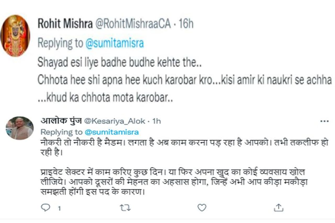 रोहित मिश्रा नाम के एक यूजर ने उनके इस ट्वीट पर प्रतिक्रिया देते हुए लिखा है- शायद इसलिए बड़े बूढ़े कहते थे कि छोटा ही सही अपना ही कुछ कारोबार करो। किसी अमीर की नौकरी से अच्छा खुद का छोटा-मोटा कारोबार। वहीं, आलोक पुंज नाम के एक यूजर ने कमेंट्स करते हुए लिखा है कि नौकरी तो नौकरी है मैडम। लगता है अब काम करना पड़ रहा है आपको। तभी तकलीफ हो रही है। प्राइवेट सेक्टर में काम करिए कुछ दिन। या फिर अपना खुद का कोई व्यवसाय खोल लीजिए। आपको दूसरों की मेहनत का अहसास होगा।