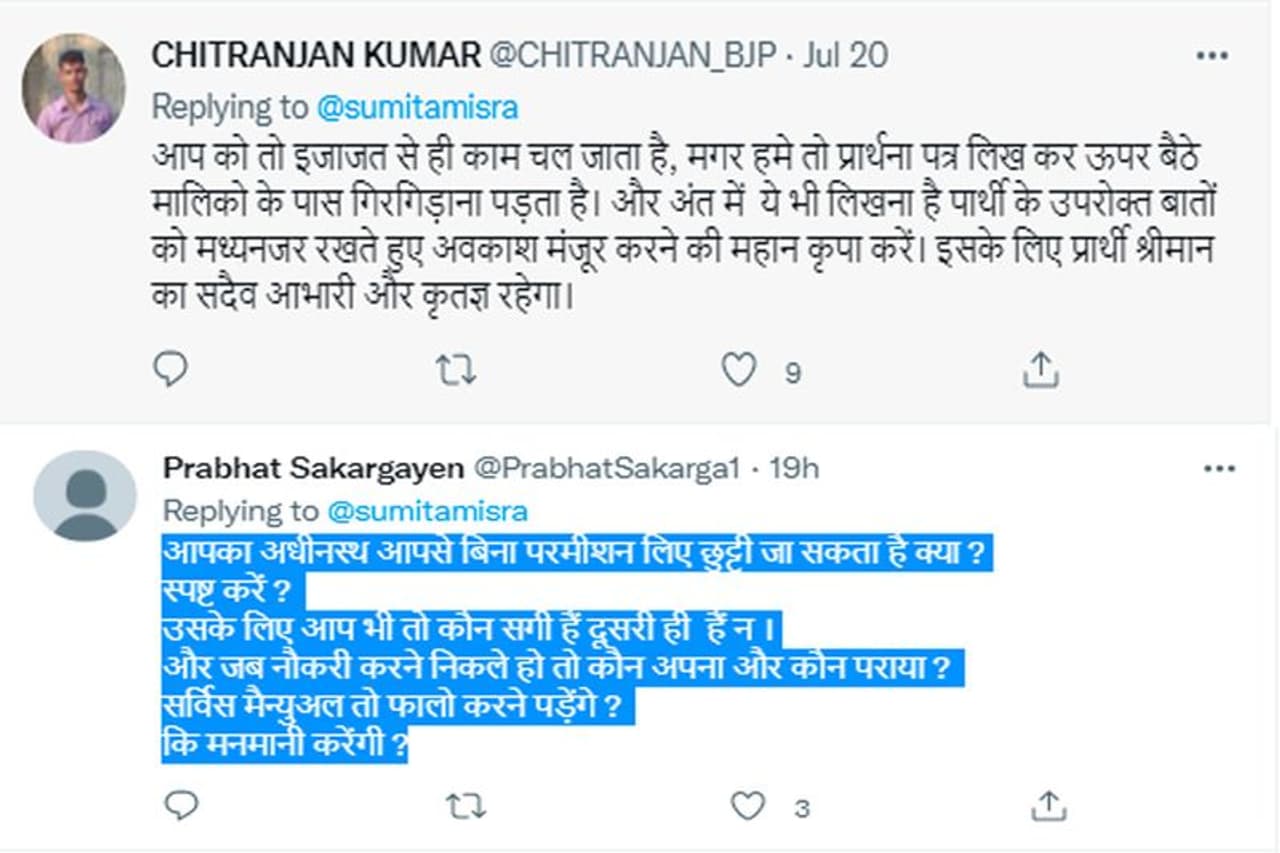 वहीं, चितरंजन कुमार नाम के एक यूजर ने उनके ट्वीट पर कमेंट किया है कि आप को तो इजाजत से ही काम चल जाता है, मगर हमे तो प्रार्थना पत्र लिख कर ऊपर बैठे मालिकों के पास गिरगिड़ाना पड़ता है और अंत में ये भी लिखना है पार्थी के उपरोक्त बातों को मद्देनजर रखते हुए अवकाश मंजूर करने की महान कृपा करें। इसके लिए प्रार्थी श्रीमान का सदैव आभारी और कृतज्ञ रहेगा। जबकि प्रभात नाम के शख्स ने लिखा है- आपका अधीनस्थ आपसे बिना परमीशन लिए छुट्टी जा सकता है क्या, स्पष्ट करें? जब नौकरी करने निकले हो तो कौन अपना और कौन पराया? सर्विस मैन्युअल तो फालो करने पड़ेंगे?
