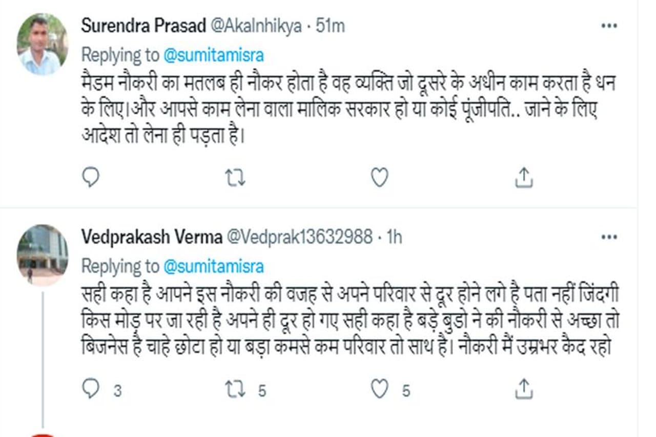 सुरेंद्र प्रसाद नाम के एक यूजर ने लिखा है- मैडम नौकरी का मतलब ही नौकर होता है। वह व्यक्ति जो दूसरे के अधीन काम करता है धन के लिए और आपसे काम लेना वाला मालिक सरकार हो या कोई पूंजीपति.. जाने के लिए आदेश तो लेना ही पड़ता है। वहीं, वेदप्रकाश वर्मा नाम के यूजर ने लिखा है-सही कहा है आपने इस नौकरी की वजह से अपने परिवार से दूर होने लगे है पता नहीं जिंदगी किस मोड़ पर जा रही है। अपने ही दूर हो गए सही कहा है बड़े-बुजर्गों ने...नौकरी से अच्छा तो बिजनेस है चाहे छोटा हो या बड़ा कमसे कम परिवार तो साथ है। नौकरी मैं उम्रभर कैद रहो।