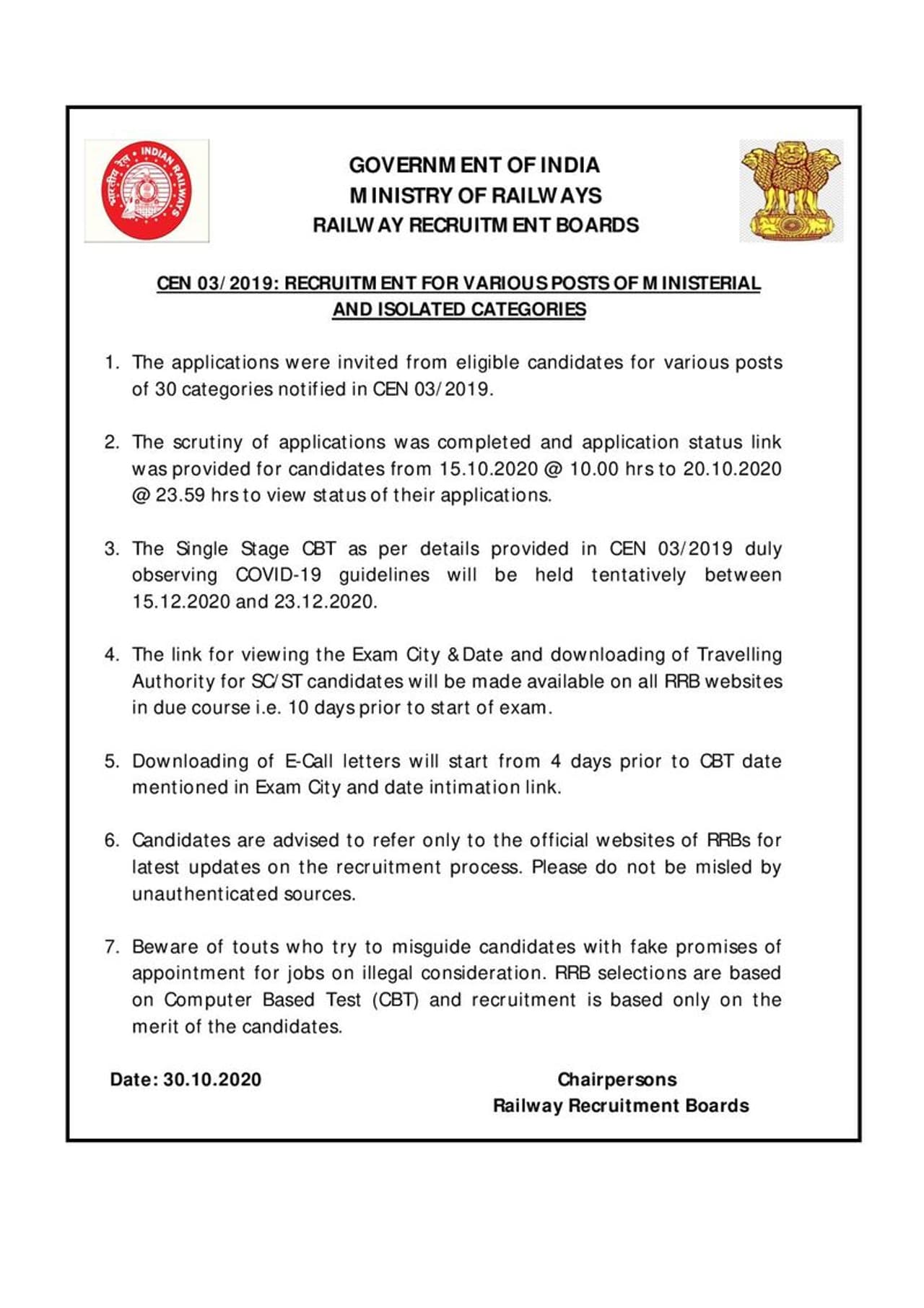 दरअसल 15 दिसंबर 2020 को रेलवे CEN 03/2019 के तहत मिनिस्टेरियल और आइसोलेटेड कैटेगरी (Ministerial and isolated Categories) की परीक्षा ले रहा है। हालांकि इस परीक्षा को लेकर भी संशय बना हुआ है।