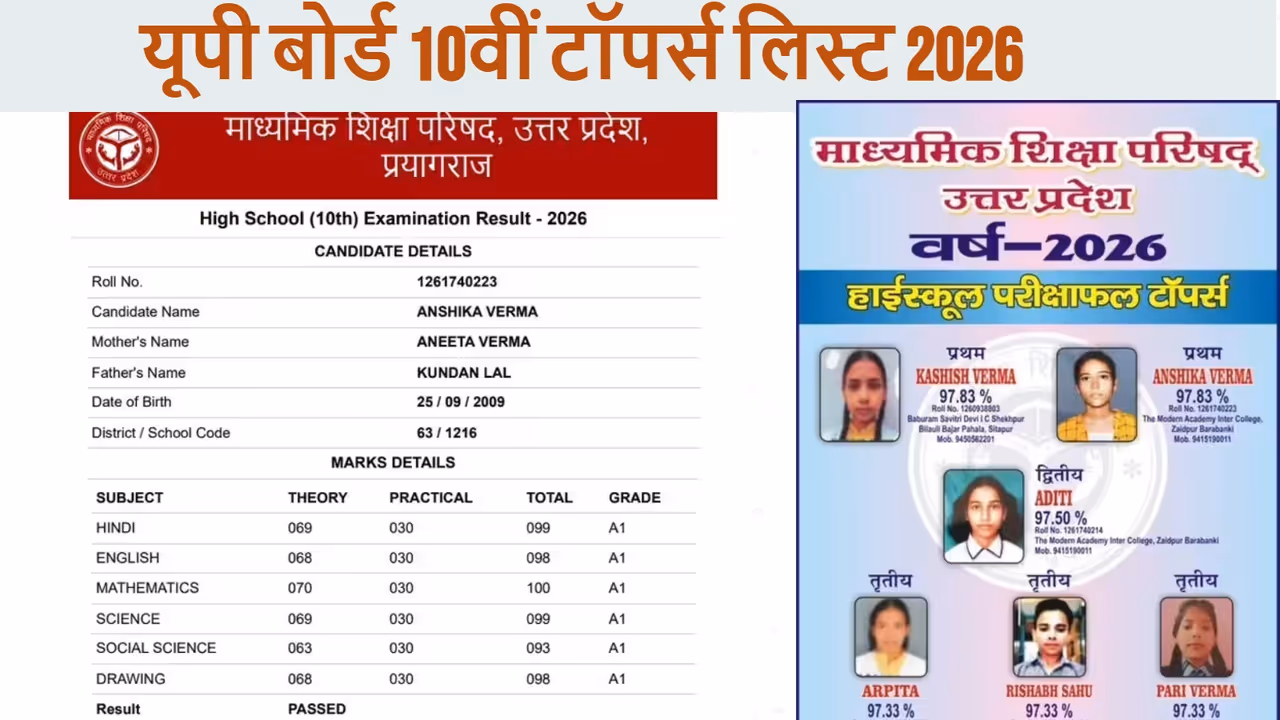 UP Board High School Topper List 2026: यूपी बोर्ड 10वीं रिजल्ट 2026 जारी कर दिया गया है। इस साल यूपी बोर्ड हाईस्कूल में कशिश वर्मा और अंशिका वर्मा ने 97.83% के साथ किया टॉप। देखें पूरी टॉपर्स लिस्ट, नाम, मार्क्स, रिजल्ट लिंक और जरूरी डिटेल्स।