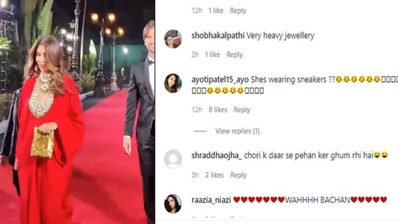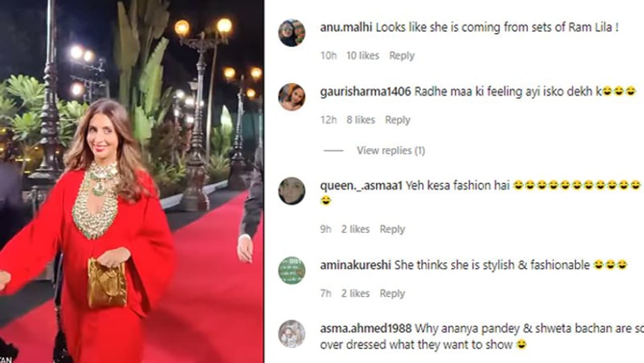 श्वेता बच्चन का अजीबोगरीब लुक देखकर लोग हैरान है और जमकर ताने मार रहे है। एक ने लिखा- चोरी के डर से सारे गहने पहनकर घूम रही है। एक अन्य ने लिखा- इसे देखकर ऐसा लग रहा है जैसे ये राम लीला के सेट से आ रही है। एक ने लिखा- राधे मां की फीलिंग आई इसको देखकर। एक ने ताना मारते हुए लिखा- ये कैसा बेकार सा लुक है, झोला पहनकर आ गई। एक ने चौंकते हुए लिखा- ये तो जूते पहनकर आई है। एक बोला- ये कैसा फैशन है तो दूसरे ने कहा- ये कुछ भी पहन लेते और फैशन बन जाता है। एक ने भड़ास निकालते हुए लिखा- इसे लग रहा है कि ये सबसे ज्यादा स्टाइलिश और फैशनेबल है। एक बोला- ये पार्टी है या फैशन शो। एक ने लिखा- इनको तो मौका चाहिए ज्वैलरी पहनने का। एक ने लिखा- श्वेता बच्चन ओवर ड्रेस होकर आई है आखिर ये दिखाना क्या चाहती है।