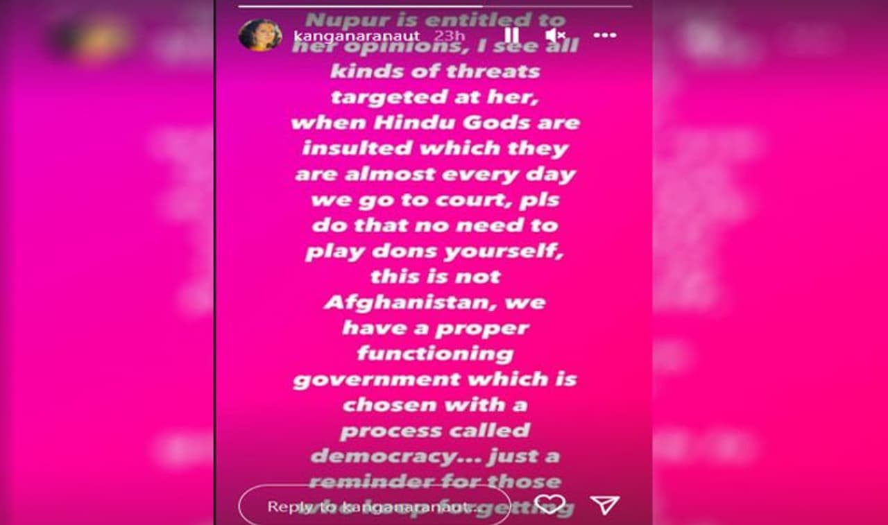 कंगना रनौत ने अपने इंस्टा स्टोरी पर नूपुर के पक्ष में कई बातें लिखीं। अदाकारा ने लिखा,'नूपुर अपनी राय रखने की हकदार हैं। मैं देख रही हूं हर दिन उन्हें हर तरह की धमिकयां मिल रही हैं। वो लोग लगभग हर दिन हिंदू देवताओं को अपमानित करते हैं। हम कोर्ट जाते हैं।कृपया डॉन बनने की जरूरत नहीं है। ये अफगानिस्तान नहीं है। हमारे पास अच्छी सरकार है, जिसे लोकतंत्र नामक प्रक्रिया के साथ चुना गया है। जो भूल गए हैं उनके लिए बस ये एक रिमाइंडर है।