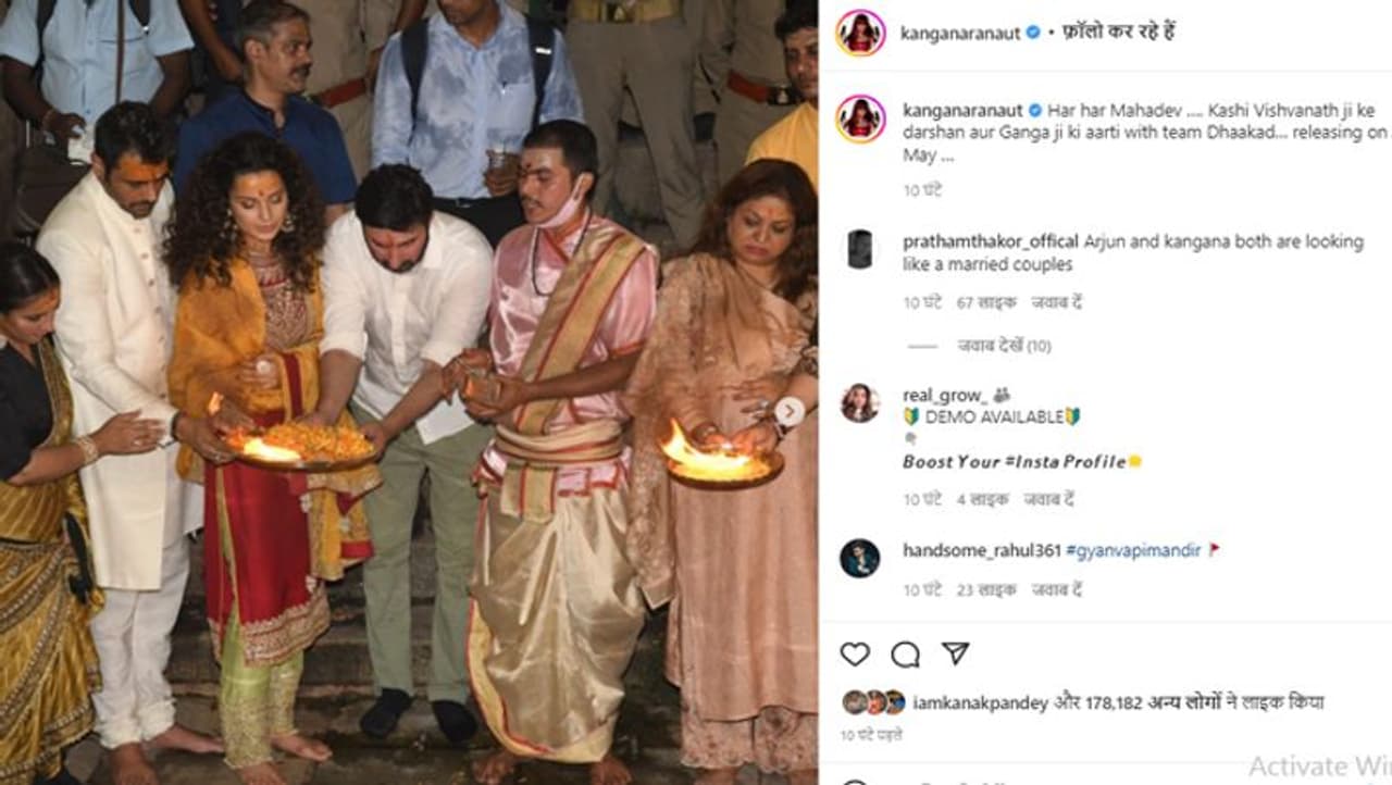 कंगना रनोट फिल्म धाकड़ में जबरदस्त एक्शन मोड में नजर आने वाली है। फिल्म में उन्होंने खतरनाक स्टंट किए है। हाल ही में आए फिल्म के ट्रेलर में कंगना का एक अलग ही रूप देखने को मिल रहा है। वे इन दिनों फिल्म के प्रमोशन में बिजी है और धर्मिक स्थानों पर भी जाकर प्रमोशन कर रही है और भगवान से आशीर्वाद ले रही है। बीते दिनों वे अपनी फिल्म की पूरी टीम के साथ काशी विश्वनाथ के दर्शन करने बनारस पहुंची। मंदिर में पूजा करते कुछ फोटोज उन्होंने अपने इंस्टाग्राम पर भी शेयर की है। उन्होंने फोटोज शेयर कर लिखा - हर हर महादेव, काशी विश्वनाथ जी के दर्शन और गंगा आरती धाकड़ की पूरी टीम के साथ, जो 20 मई को रिलीज हो रही है। कंगना की फोटोज पर फैन्स जमकर कमेंट्स कर रहे है। ज्यादातर ने उन्हें फिल्म के लिए बधाई तो कुछ ने कहा- एक ही तो क्वीन है बॉलीवुड में।