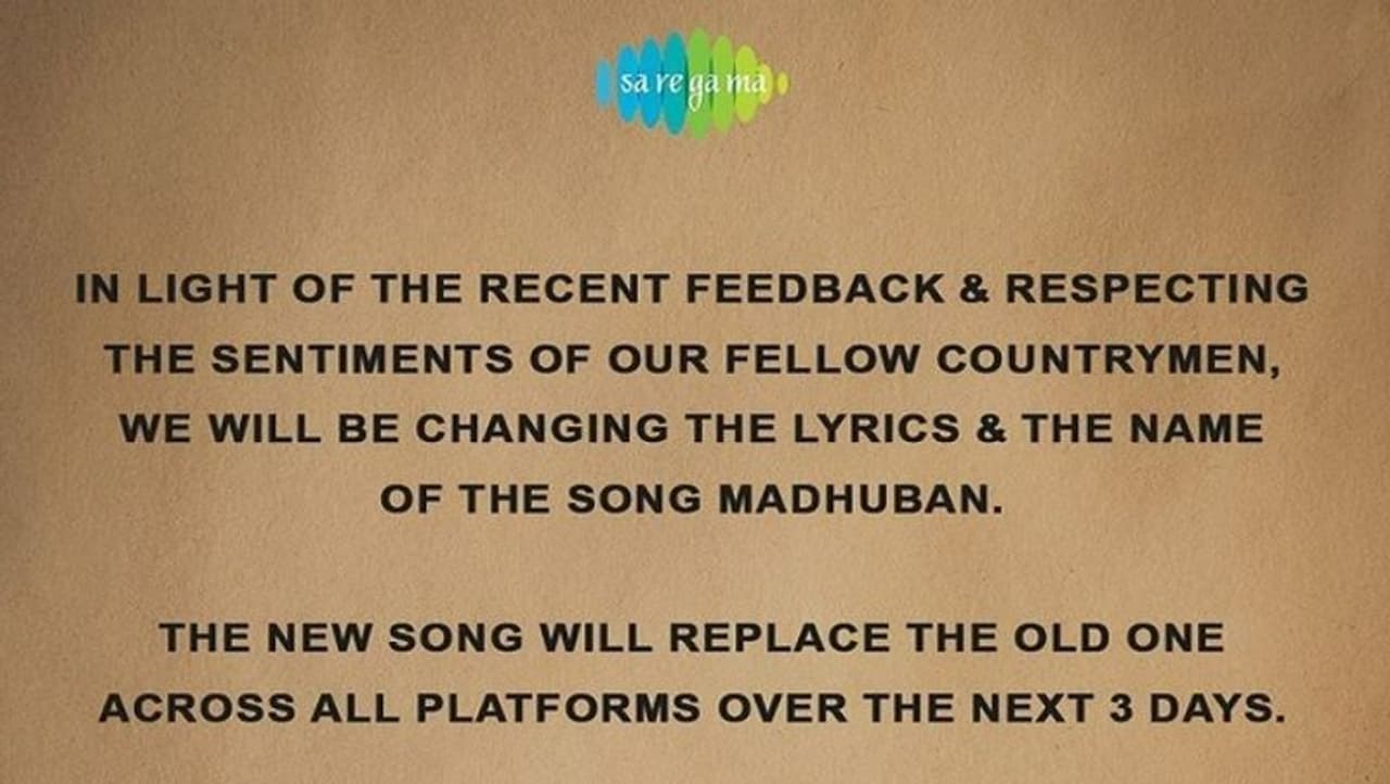 वृंदावन के संतों और मध्यप्रदेश सरकार की चेतावनी के बाद म्यूजिक लेबल सारेगामा ने विवादित गाना 'मधुबन में राधिका नाचे' की लिरिक्स बदलने का फैसला लिया है।
