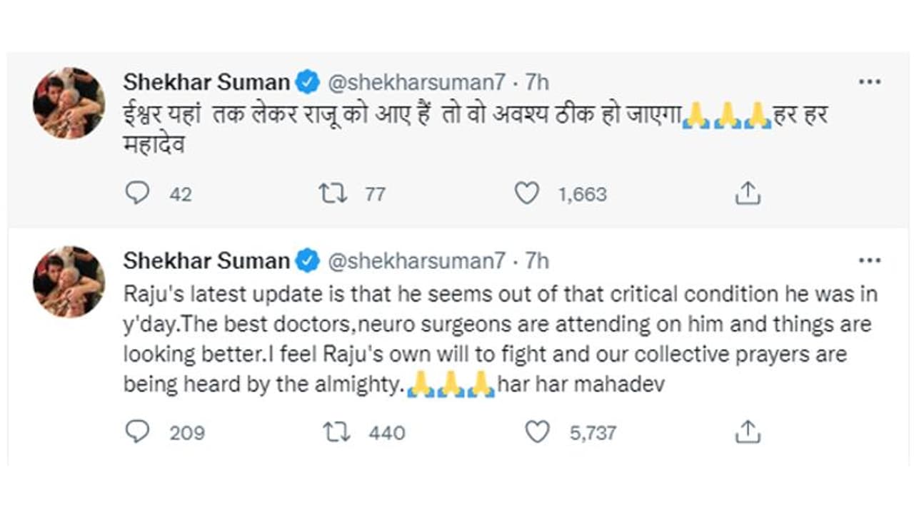 इधर राजू के दोस्त शेखर सुमन ने भी ट्वीट कर जानकारी दी है कि वे कल के मुकाबले गंभीर हालत से बाहर आ गए हैं। सबसे बेहतर डॉक्टर्स और न्यूरो सर्जन उनकी देखभाल कर रहे हैं। चीजें बेहतर दिख रही हैं। मुझे लगता है कि राजू की लड़ने की इच्छाशक्ति और सामूहिक प्रार्थनाएं सर्वशक्तिमान द्वारा सुनी जा रही हैं। हर-हर महादेव।"
