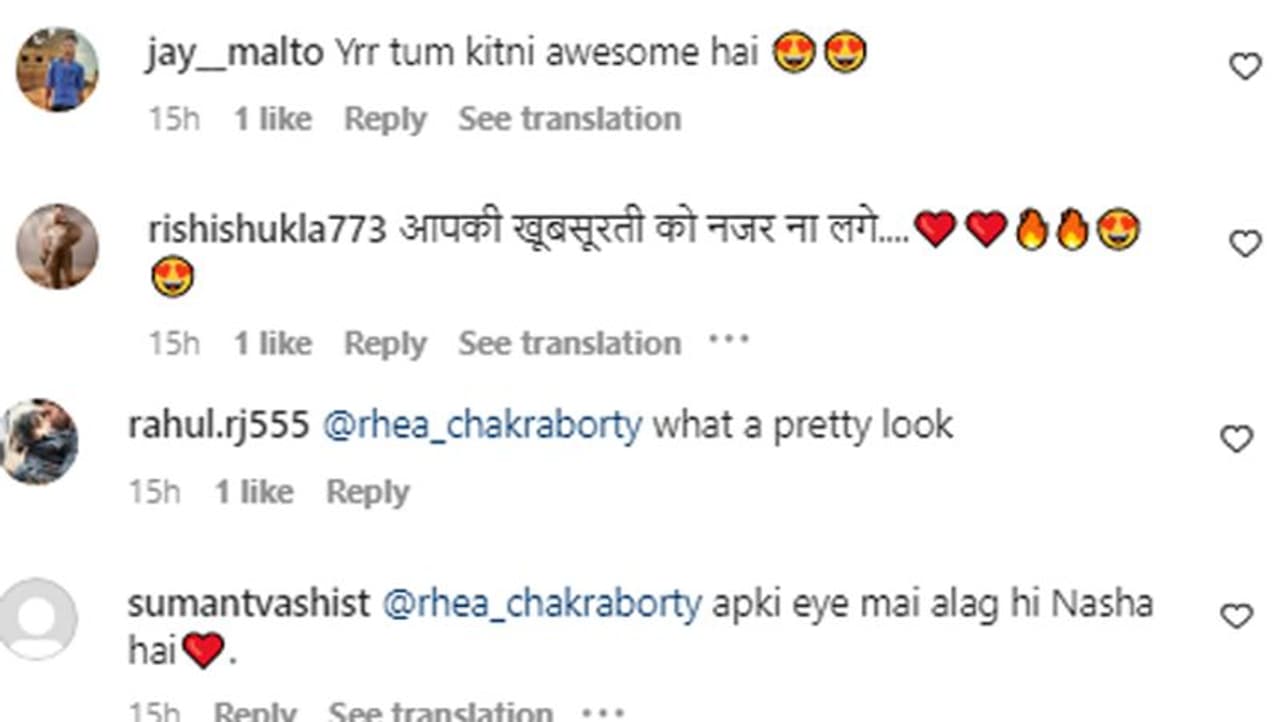 एक यूजर ने रिया की ख़ूबसूरती की तारीफ़ करते हुए लिखा है, "आपकी खूबसूरती को नजर ना लगे।" एक यूजर ने लिखा है, "यार तुम कितनी ख़ूबसूरत हो।" एक यूजर ने लिखा है, "क्या खूबसूरत लुक है।" एक यूजर का कमेंट है, "रिया चक्रवर्ती आपकी आंखों में एक अलग ही नशा है।"
