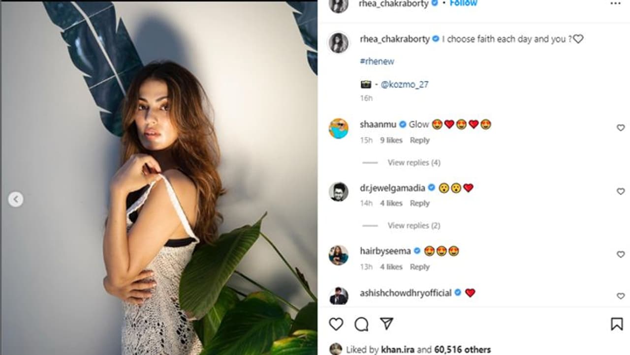 तस्वीरों में देखा जा सकता है कि रिया चक्रवर्ती ने व्हाइट कलर की जालीदार ड्रेस पहनी हुई है, जिसमें से उनकी ब्लैक कलर की ब्रा भी दिखाई दे रही है। तस्वीर को कैप्शन देते हुए रिया ने लिखा है, "मैं हर दिन यकीन को चुनती हूं और आप?" जवाब में कोई यकीन को चुनने की बात कर रहा है तो कोई खुद रिया को चुनने की। कोई मुश्किल को अपना सिलेक्शन बता रहा है तो कोई प्यार का जिक्र कर रहा है। लेकिन कैप्शन से ज्यादा ध्यान लोगों का रिया की तस्वीरों पर हैं और वे उनकी खूबसूरती की तारीफ़ करते नहीं थक रहे हैं।