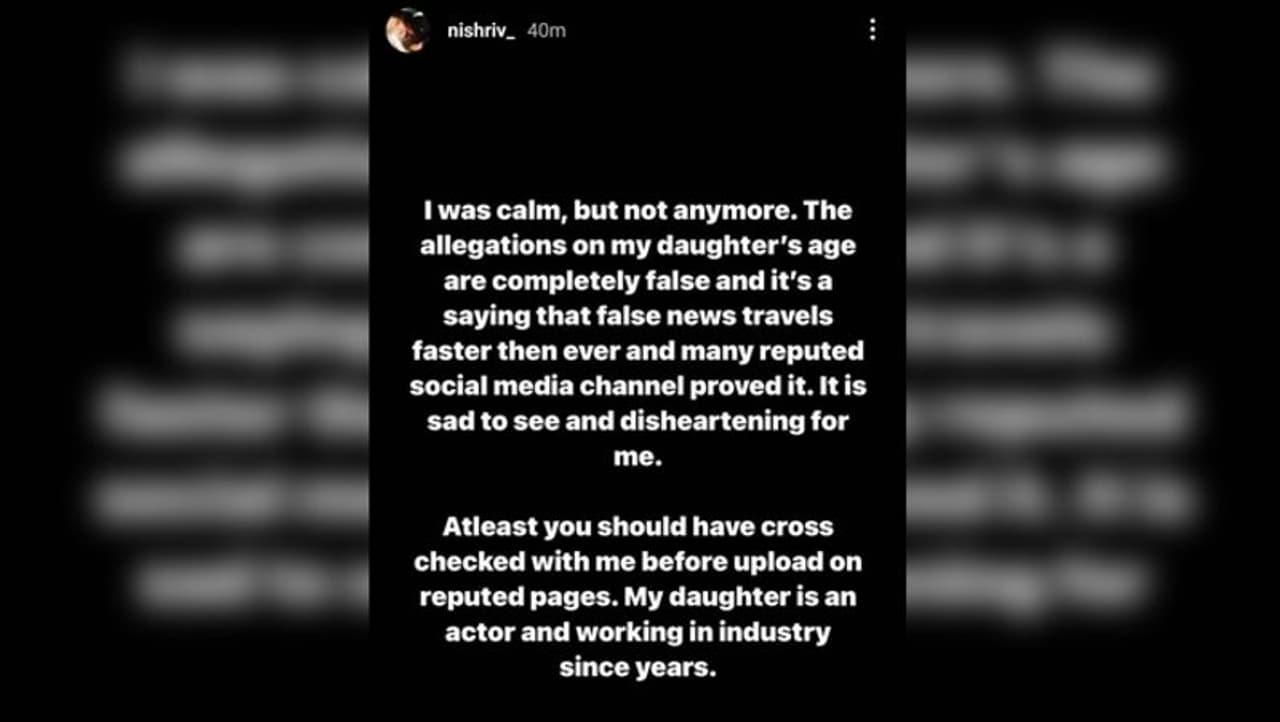निशा ने सोशल मीडिया के जरिए भी सफाई दी है। उन्होंने अपनी इंस्टाग्राम स्टोरी पर लिखा है, "मैं शांत थी। लेकिन अब और नहीं। मेरी बेटी की उम्र को लेकर लगाए जा रहे आरोप गलत हैं। एक कहावत है ना कि झूठ बहुत तेजी से फैलता है। कई प्रतिष्ठित सोशल मीडिया चैनल्स ने इसे साबित कर दिया। मेरे लिए यह दुखद और निराशाजनक है। प्रतिष्ठित पेजों पर अपलोड करने से पहले कम से कम मुझसे क्रॉस चेक तो करना चाहिए था। मेरी बेटी एक्ट्रेस है और सालों से इंडस्ट्री में काम कर रही है।"
