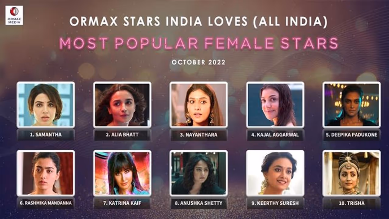 ऑरमैक्स स्टार्स इंडिया ने हाल ही में इंडिया की टॉप 10 पॉपुलर एक्ट्रेसेस की लिस्ट जारी की है। सामने आई इस लिस्ट से पता चलता है कि इसमें साउथ एक्ट्रेस सामंथा रुथ प्रभु पहले नंबर पर है। लिस्ट में साउथ हीरोइनों ने अपना दबदबा बनाकर रखा है।