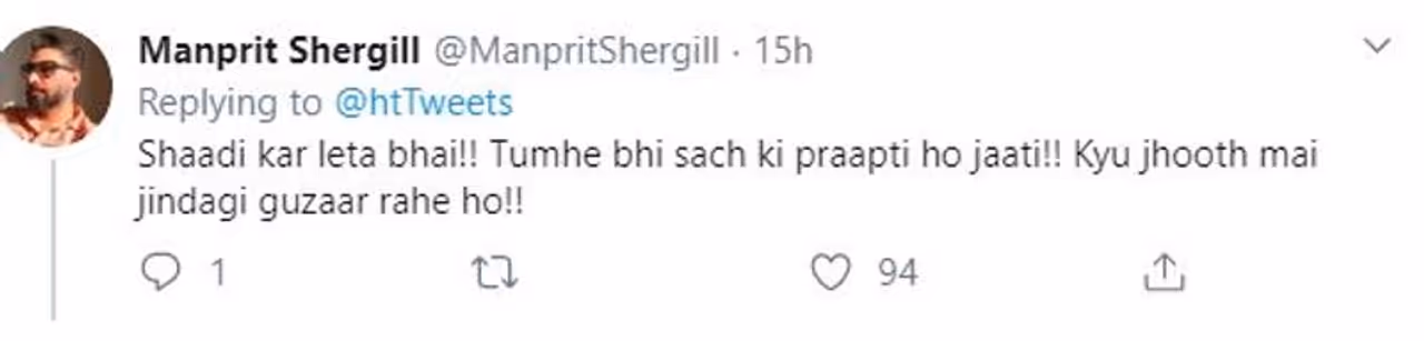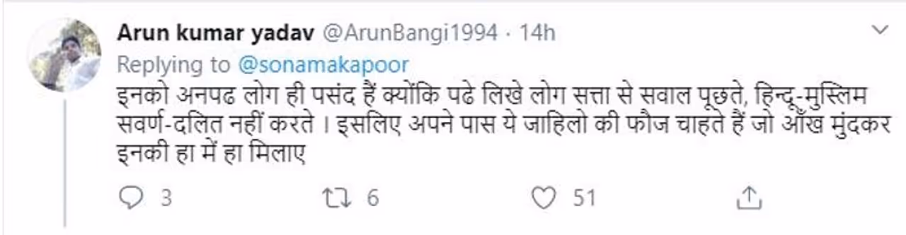 एक शख्स ने कमेंट करते हुए लिखा- इनको अनपढ लोग ही पसंद हैं क्योंकि पढे लिखे लोग सत्ता से सवाल पूछते, हिन्दू-मुस्लिम सवर्ण-दलित नहीं करते । इसलिए अपने पास ये जाहिलो की फौज चाहते हैं जो आँख मुंदकर इनकी हा में हा मिलाए। एक अन्य बोला- इन्होंने शादी नहीं कि इसलिए ये कुछ भी कह सकते हैं। एक बोला- सैफ-अमृता, आमिर, मलाइका-अरबाज़, करिश्मा-संजय, ऋतिक -सुजैन, अनुराग-कल्कि सब बेहद पढ़े लिखे हैं। तो क्या कारण रहा तलाक का, आप बताएं? क्या एक दूसरे पर विश्वास की कमी या ब्याह का रस खत्म? एक बोला- शादी कर लेता भाई, तुम्हें भी सच ती प्राप्ति हो जाती। क्यों झूठ में जिंदगी गुजार रहे हो।