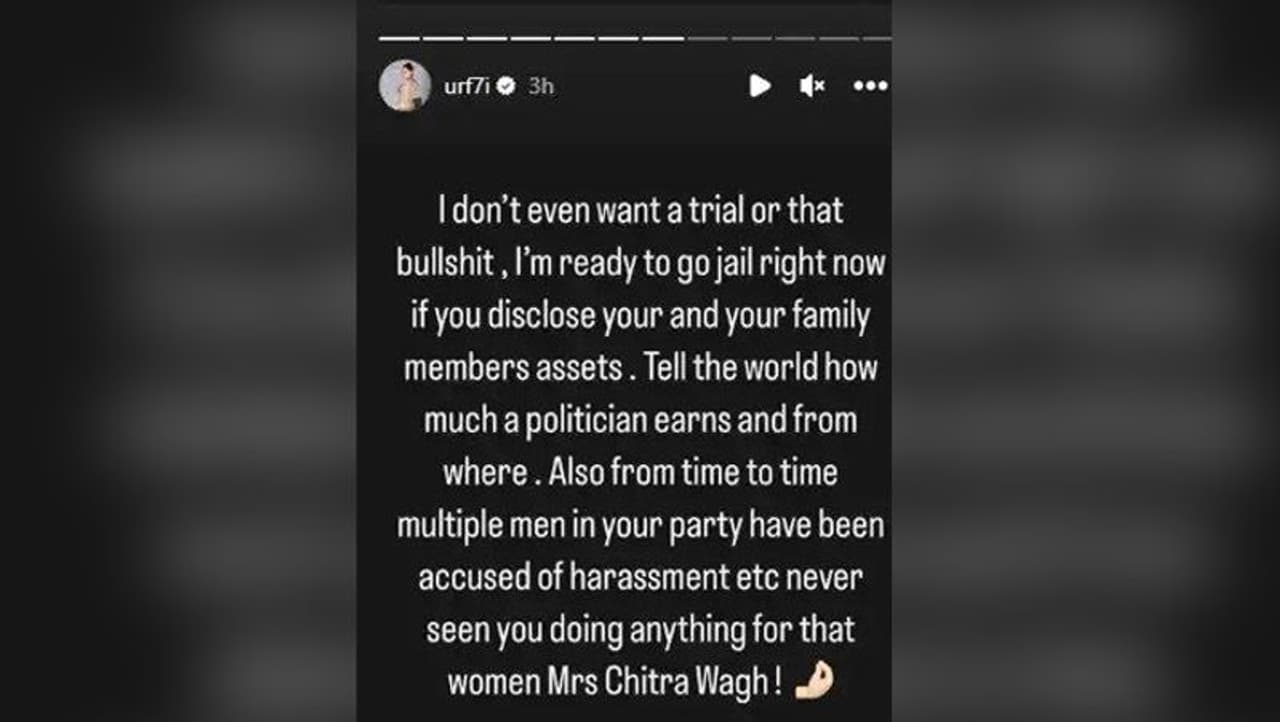 उर्फी ने आगे लिखा है, "मैं कोई ट्रायल और बकवास भी नहीं चाहती हूं। अगर आप अपनी और अपने परिवार की संपत्ति का खुलासा कर दें तो मैं अभी जेल जाने को तैयार हूं। दुनिया को बताएं कि पॉलिटिशियन कितना और कहां से कमाते हैं। साथ ही समय-समय पर आपकी पार्टी के कई पुरुषों पर उत्पीड़न के आरोप लगे हैं, आपको कभी उन महिलाओं के लिए कुछ करते नहीं देखा मिसेज चित्रा वाघ।"