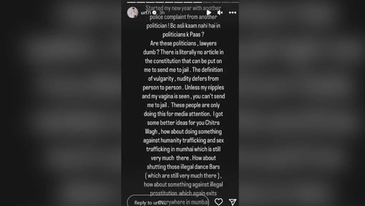 उर्फी ने आगे लिखा है, "मेरे नए साल की शुरुआत एक और पॉलिटिशियन की पुलिस शिकायत से हुई। असली काम नहीं है इन पॉलिटिशियंस के पास? क्या इन पॉलिटिशियंस के वकील मूर्ख हैं? संविधान में ऐसा कोई आर्टिकल नहीं है, जिसके तहत मुझे जेल भेजा जा सके। अश्लीलता और न्यूडिटी की परिभाषा हर इंसान के लिए अलग है। जब तक मेरे नि&#@ और वैजा&$ ना दिखें, आप मुझे जेल नहीं भेज सकते। ये लोग यह सिर्फ मीडिया अटेंशन के लिए कर रहे हैं। चित्रा वाघ, मेरे पास आपके लिए बेहतर आइडिया हैं। मुंबई ह्यूमन ट्रैफिकिंग और सेक्स ट्रैफिकिंग के बारे में क्या ख्याल है, जो कि अब भी काफी हो रहा है। उन गैरकानूनी डांस बारों को बंद करने को लेकर क्या ख्याल है (जो अब भी काफी ज्यादा हैं), गैरकानूनी देहव्यापार के खिलाफ क्या रही हैं, जो फिर से मुंबई में हर जगह मौजूद है।"