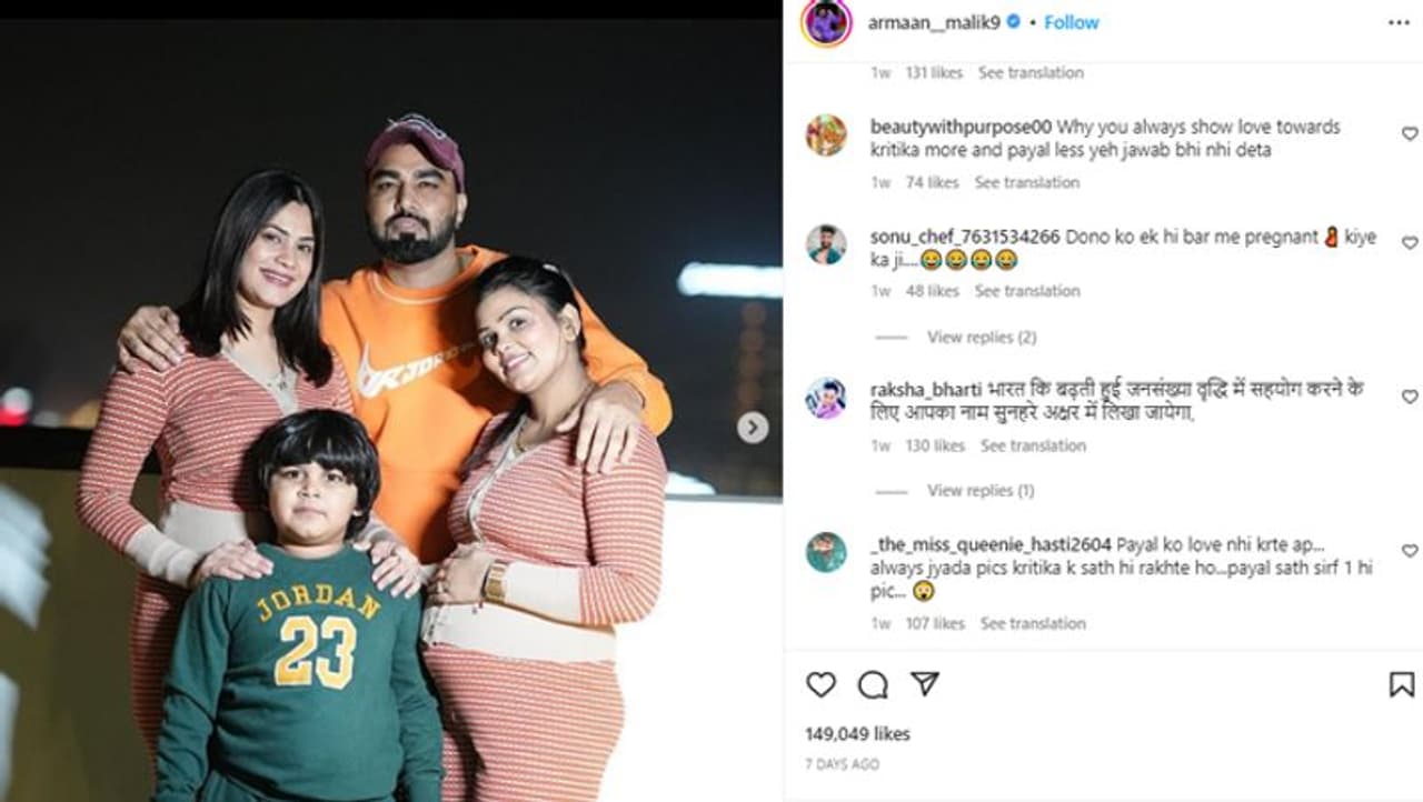 अरमान द्वारा शेयर की गई तस्वीर में उनकी दोनों पत्नियां बेबी बंप फ्लॉन्ट कर रही हैं। इसे इसे देखने के बाद एक इंटरनेट यूजर ने कमेंट बॉक्स मजे लेते हुए में लिखा है, "दोनों को एक ही बार मे प्रेग्नेंट किए क्या?" एक अन्य यूजर ने भड़कते हुए लिखा है, "अगर पहली पत्नी से प्यार करता तो दूसरी पत्नी ना लाता।" एक अन्य यूजर ने ताना मारते हुए लिखा है, "भारत की बढ़ती जनसंख्या वृद्धि में सहयोग करने के लिए आपका नाम सुनहरे अक्षरों में लिखा जाएगा।"