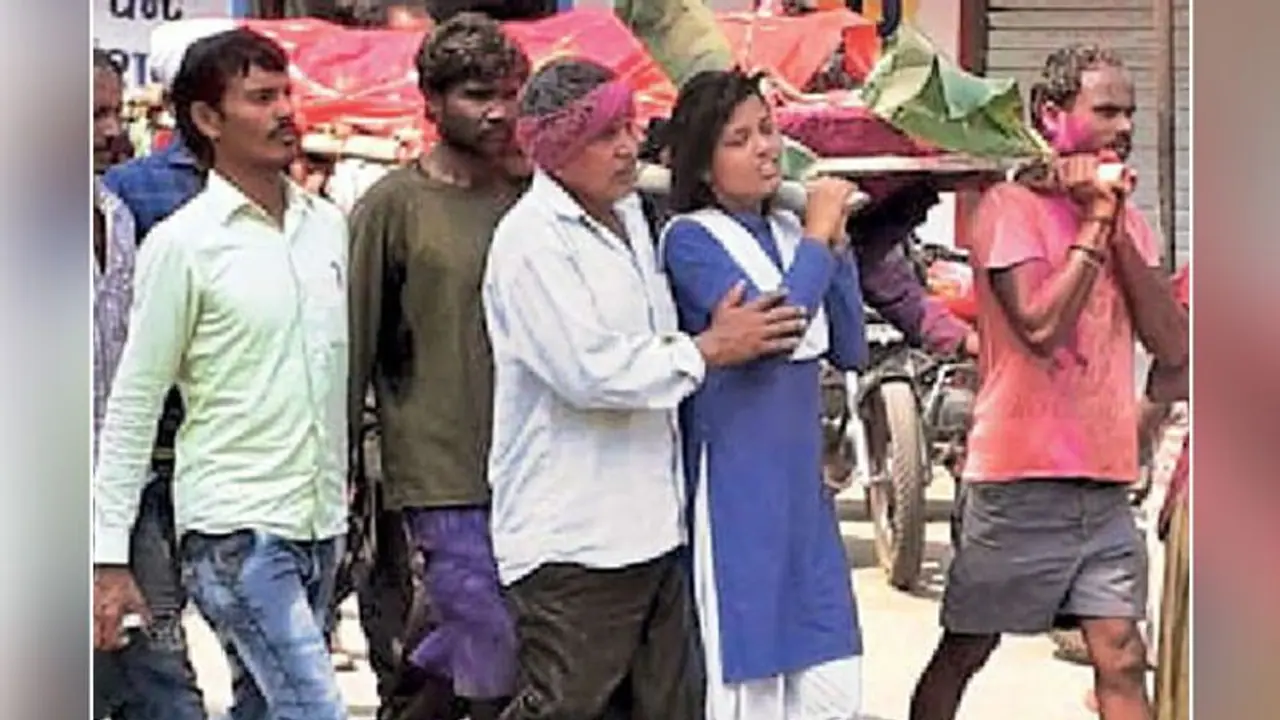 धमतरी, छत्तीसगढ़. भावुक कर देने वाला यह मंजर छत्तीसगढ़ के धमतरी का है। अपने पिता की अर्थी को कंधा देने वाली यह बेटी कुछ देर पहले ही 10वीं का एग्जाम देकर लौटी थी। जब वो एग्जाम देने स्कूल के लिए निकली थी, तब पिता की अर्थी सज रही थी। उसकी आंखों में आंसू थे, लेकिन पिता की ख्वाहिश थी कि वो अच्छे से पढ़ाई करे। इसलिए उसने पिता की चिता को मुखाग्नि देने से पहले एग्जाम देना मुनासिब समझा। उसके पिता की सड़क दुर्घटना में मौत हो गई थी।