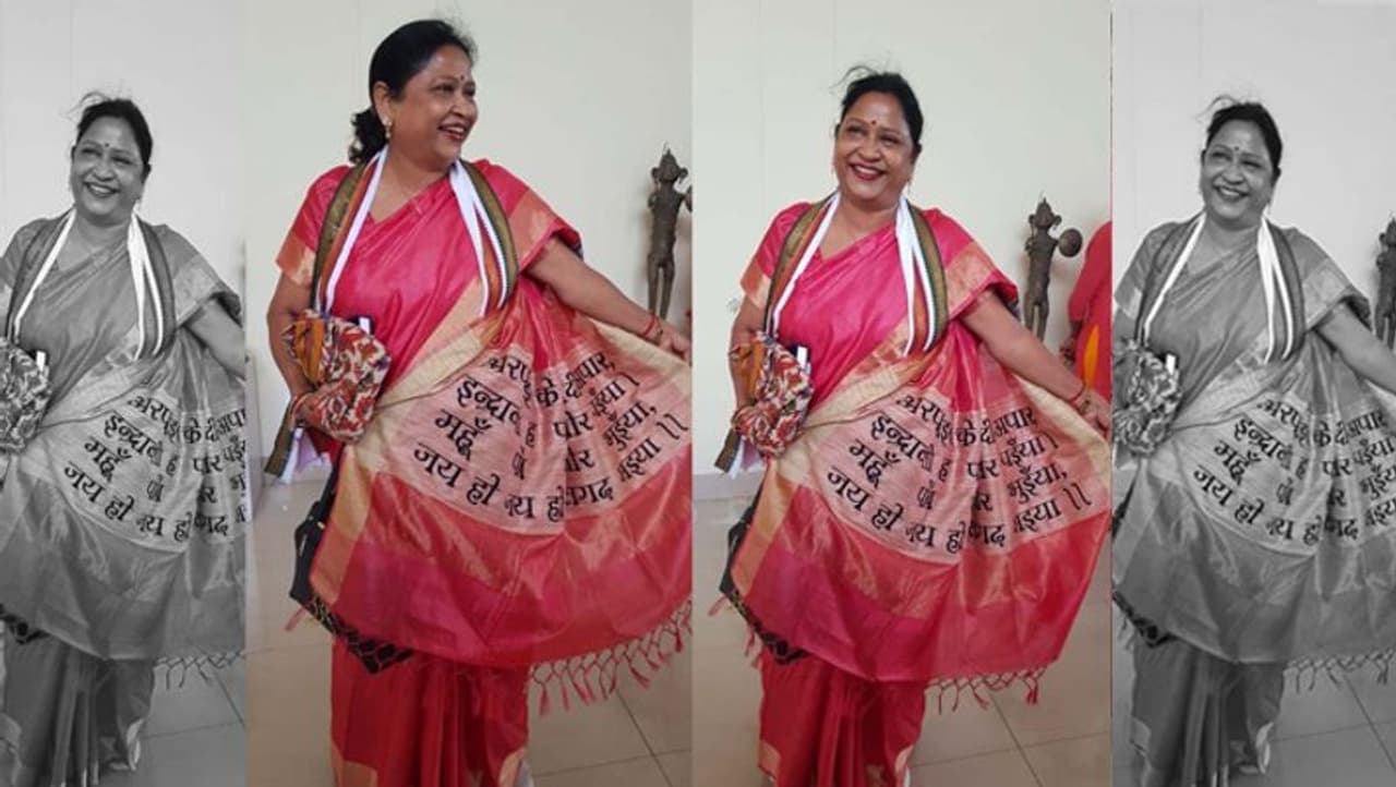ये हैं धमतरी जिले की इकलौती अनारक्षित सिहावा विधानसभा से कांग्रेस की MLA डॉ. लक्ष्मी ध्रुव। करोड़पति MLA ने अपनी साड़ी पर राज्यगीत लिखवाया हुआ है।