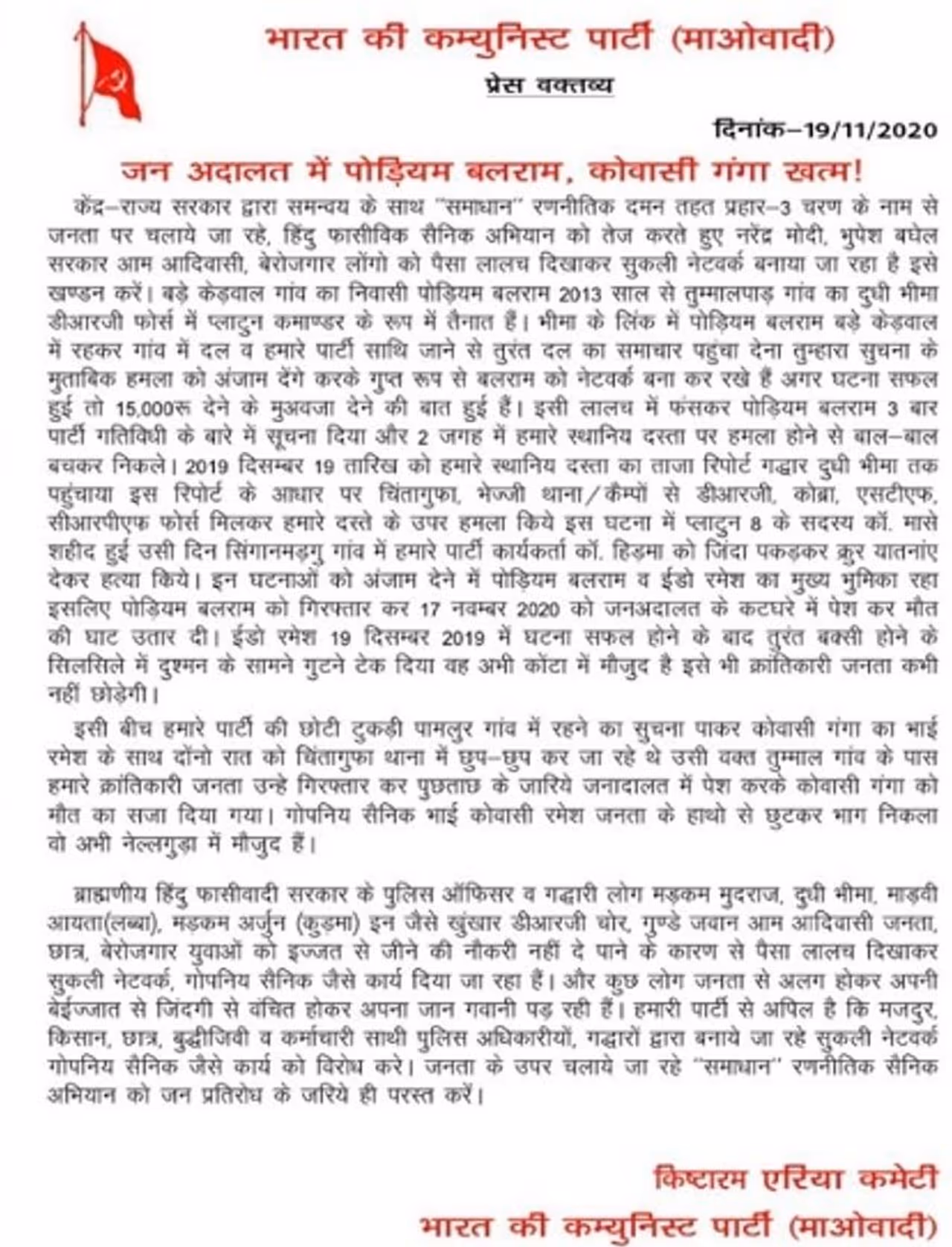 19 नवंबर को जारी प्रेस नोट आज मीडिया के हाथ लगा है। नक्सलियों की किस्टाराम एरिया कमेटी की ओर से ये प्रेस नोट जारी किया गया है। इसमें बताया गया है कि 17 नवंबर को नक्सलियों ने जन अदालत लगाकर दो युवकों की हत्या की है। इनमें एक का नाम बड़े केड़वाल गांव निवासी पोड़ियम बलराम और दूसरा पामलुर गांव निवासी कोवासी गंगा बताया गया है। दोनों पर मुखबिरी करने का आरोप लगा है।