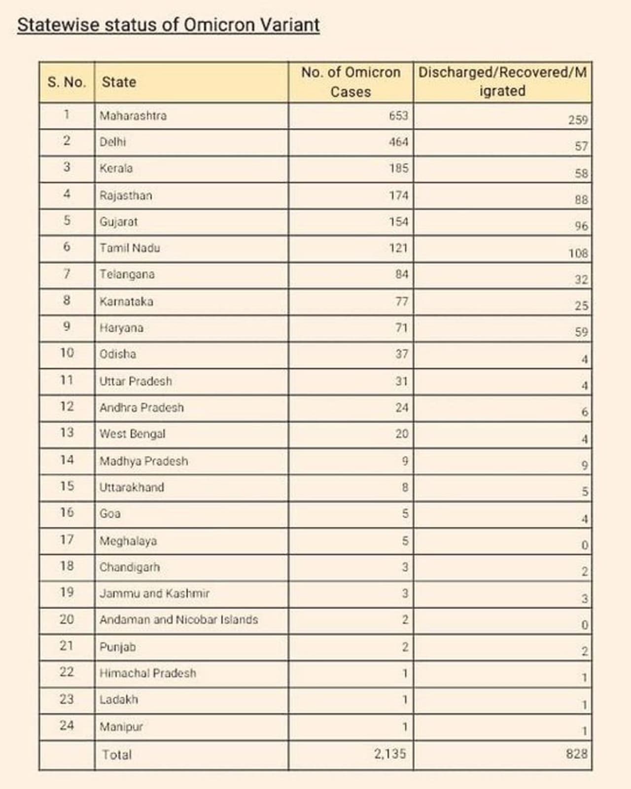 नई दिल्ली. कोरोना का नया वैरिएंट ओमिक्रोन (new variant Omicron) देश के 24 राज्यों में पहुंच गया है। अब तक इसके 2135 केस सामने आ चुके हैं। इनमें से 828 ठीक हो चुके हैं। महाराष्ट्र में सबसे अधिक 653 केस हो चुके हैं। पिछले एक दिन में 58000 से अधिक कोरोना के केस मिले हैं। इस बीच देश में वैक्सीनेशन का आंकड़ा 147.72 करोड़ के पार हो गया है।