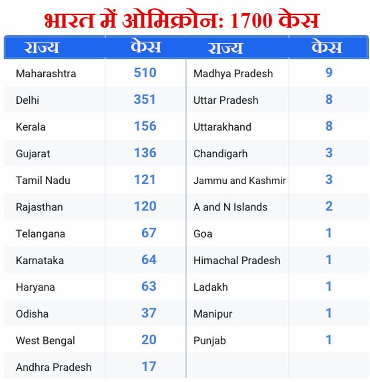 कोरोना का नया वैरिएंट ओमिक्रोन (new variant Omicron) देश के 23 राज्यों में फैल चुका है। हेल्थ मिनिस्ट्री के अनुसार देश मे इसके अब तक 1700 केस सामने आ चुके हैं। हालांकि यह राहत की बात है कि इसमें से 639 ठीक हो चुके हैं।