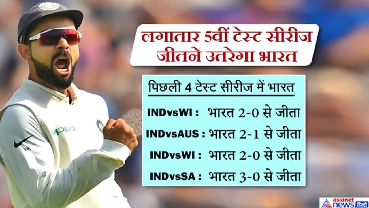 पिछली 4 टेस्ट सीरीज में भारत का प्रदर्शन शानदार रहा है। भारत ने पहले वेस्टइंडीज को अपने घर में 2-0 से हराया और फिर ऑस्ट्रेलिया जाकर 2-1 से सीरीज जीती। इस सीरीज में कुल 4 मैच खेले गए थे। एक ऑस्ट्रलिया ने जीता 2 मैच भारत के नाम रहे और एक मैच ड्रा हो गया था। इसके बाद भारत ने वेस्टइंडीज को उसके घर में ही 2-0 से हराया और अंत में दक्षिण अफ्रीका को भारत में 3-0 से हराकर भारतीय टीम लगातार 4 टेस्ट सीरीज जीत चुकी है। बांग्लादेश के साथ मौजूदा सीरीज में भी भारत ने 1-0 की बढ़त ले ली है और अगला मैच जीतकर लगातार 5 टेस्ट सीरीज जीतना चाहेगा।