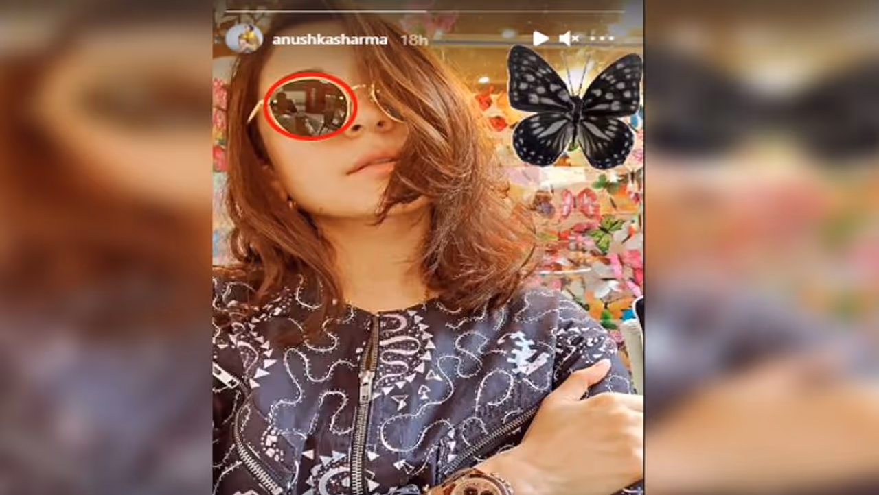बॉलीवुड एक्ट्रेस अनुष्का शर्मा अपनी प्रेग्नेंसी के बाद से ही फिल्मी दुनिया से दूर है और इन दिनों अपने पति विराट कोहली के साथ इंग्लैंड में छुट्टियां इंजॉय कर रही हैं। इस बीच मंगलवार को उन्होंने अपनी एक बहुत ही ग्लैमरस सेल्फी इंस्टाग्राम पर शेयर की। जिसमें वह ब्लू कलर का टॉप पहने बेहद खूबसूरत लग रही है, लेकिन इस तस्वीर में ध्यान देने वाली बात यह है कि अनुष्का के चश्मे में विराट कोहली की झलक भी देखी जा रही है। इस फोटो को ध्यान से देखने पर आप देखेंगे कि अनुष्का ने जो सन ग्लासेस पहने हुए हैं उसमें विराट कोहली भी दिख रहे हैं और वह मोबाइल में कुछ देखते हुए नजर आ रहे हैं। कुछ ही देर में अनुष्का की फोटो सोशल मीडिया पर वायरल हो गई।