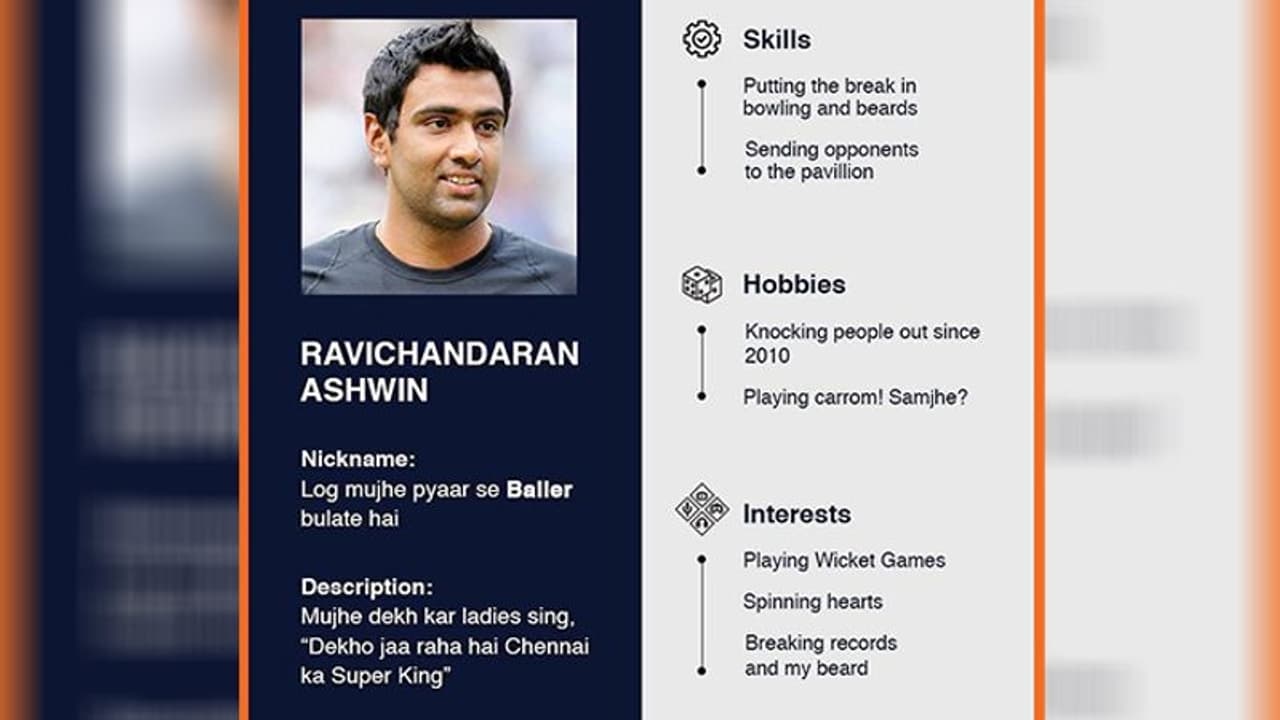 टीम इंडिया के ऑफ स्पिनर रविचंद्रन अश्विन ने इंस्टाग्राम पर अपना मजेदार सीवी शेयर किया है। इस सीवी में अश्विन ने अपने बारे में कई मजेदार बातें लिखी हैं। अपने निकनेम को लेकर उन्होंने लिखा है कि लोग मुझे प्यार से बॉलर बुलाते हैं।