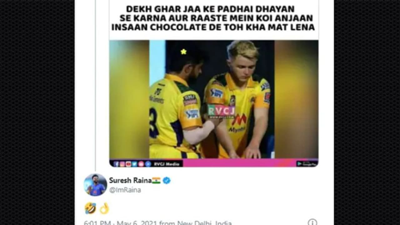 सोशल मीडिया में वायरल हो रहे मीम्स में सुरेश रैना (Suresh Raina) और सैम कुरेन (Sam Curran) बात करते नजर आ रहे हैं और फोटो में लिखा हुआ है 'घर लौटने के बाद अच्छे से पढ़ाई करना और अगर कोई अनजान शख्स चॉकलेट दें तो खा मत लेना।
