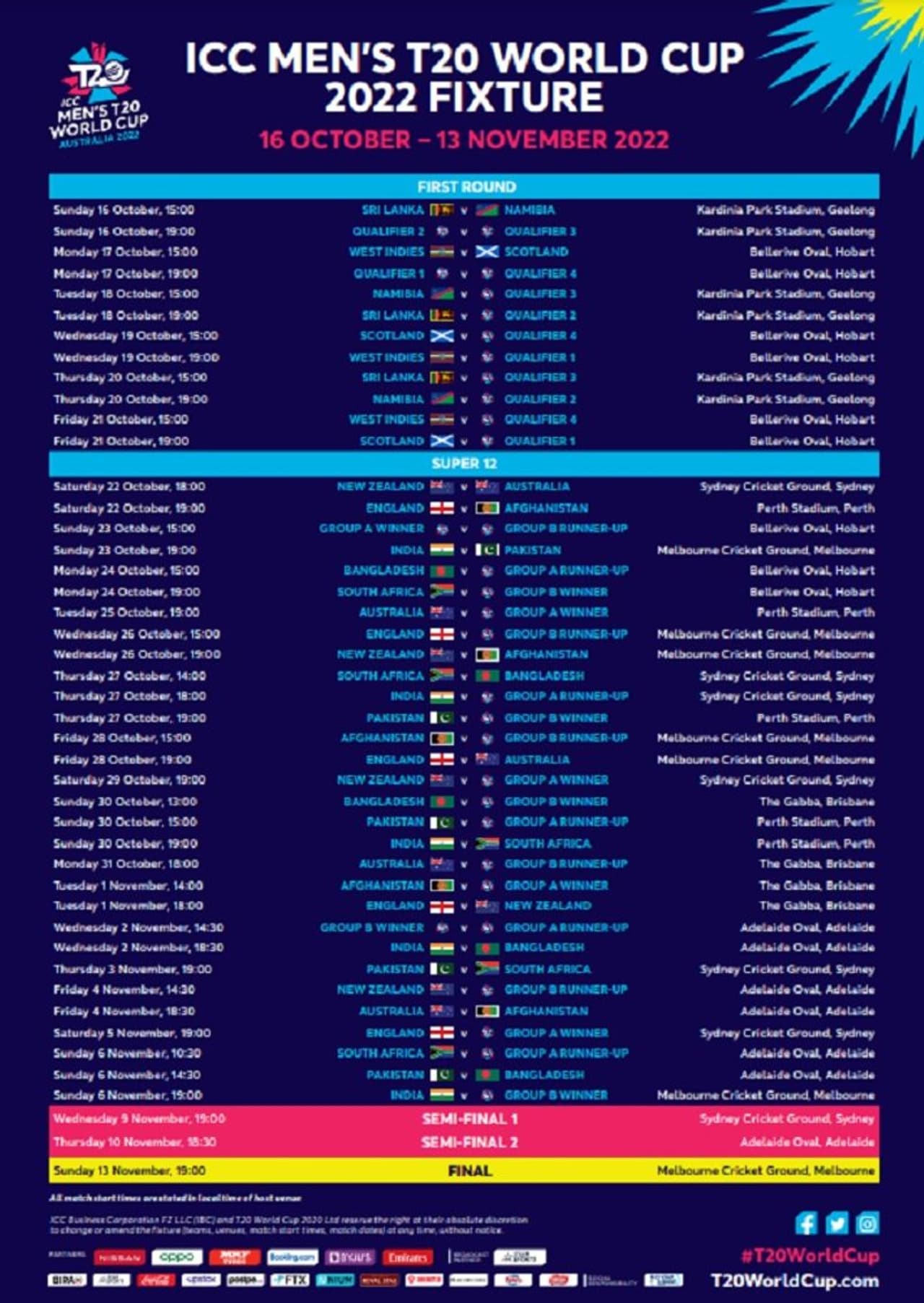 ऑस्ट्रेलिया में होने वाले ICC T-20 वर्ल्डकप 2022 का शेड्यूल जारी हो गया है। भारत का पहला मुकाबल 23 अक्टूबर को पाकिस्तान के साथ होगा।