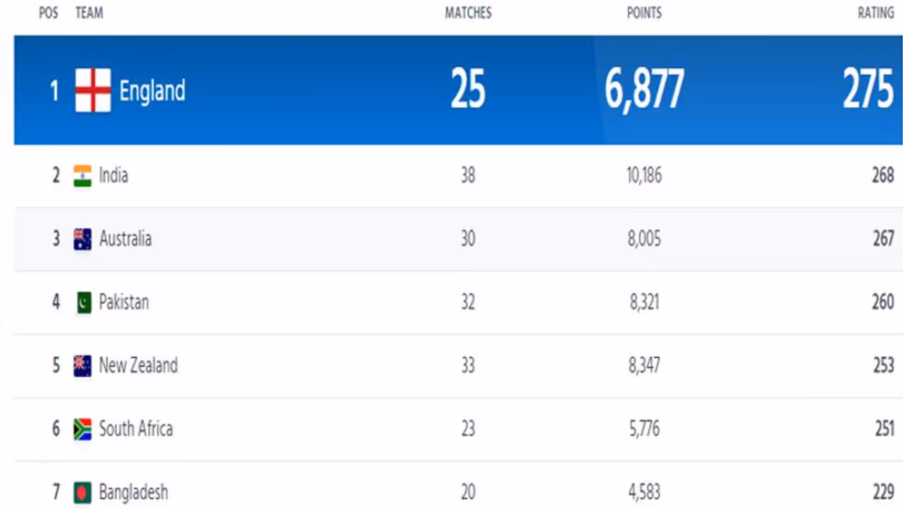 ICC के मौजूदा टी 20 आंकड़ों पर नजर डाली जाए तो, 275 रेटिंग के साथ इंग्लैंड पहले नंबर पर काबिज है। वहीं, दूसरे नंबर पर भारत 268 रेटिंग और ऑस्ट्रेलिया 267 रेटिंग के साथ तीसरे नंबर पर है। इंग्लैंड के प्वॉइंट्स 6877 और भारत के प्वॉइंट्स 10,186 है। दोनों टीमों के बीच पांच मैचों की टी20 इंटरनेशनल सीरीज का आगाज शुक्रवार को होना है। इस सीरीज के बाद टीमों की रैंकिंग में कुछ और बदलाव देखने को मिल सकते हैं। वहीं, आईसीसी रैकिंग में चौथे नंबर पर 260 रेटिंग के साथ पाकिस्तान और पांचवें नंबर पर 253 रेटिंग के साथ न्यूजीलैंड की टीम है। इसके बाद लिस्ट में साउथ अफ्रीका, बांग्लादेश, वेस्टइंडीज, अफगानिस्तान और श्रीलंका टॉप 10 में हैं।
