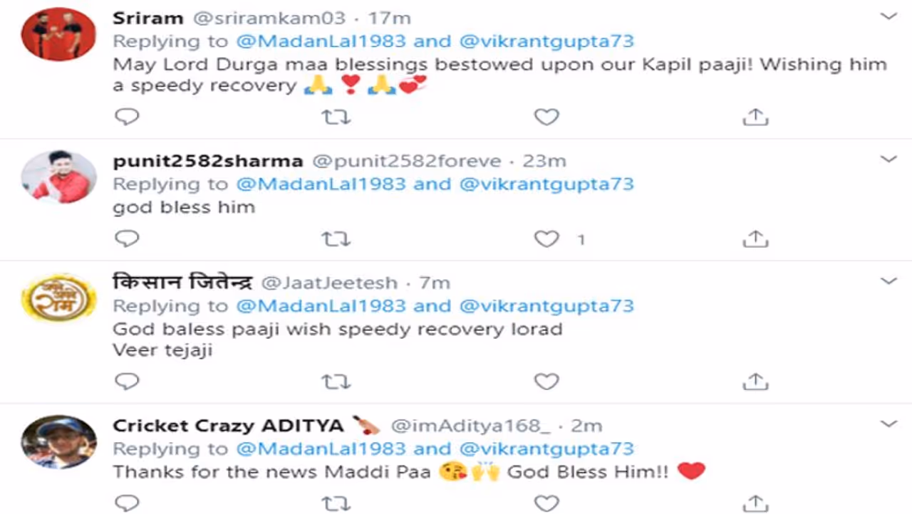 कपिल देव के अस्पताल में भर्ती होने की खबर सामने आने के बाद फैंस और कई पूर्व क्रिकेटर्स उनके जल्दी स्वस्थ होने की कामना कर रहे हैं। कांग्रेस सांसद शशि थरूर ने उनके स्वास्थ्य के लिए चिंता व्यक्त की और उनके जल्द स्वस्थ होने की कामना की। इसके साथ ही 1983 कपिल देव के साथी रहे मदनलाल ने ट्वीट कर लोगों को बताया कि जब कपिल देव को कुछ दिक्कत महसूस हुई, तो उन्हें अस्पताल ले जाया गया। डॉक्टर्स उनकी निगरानी कर रहे हैं और जल्द ही वो घर वापस आएंगे। हम सभी उनके अच्छे स्वास्थ्य की कामना करते हैं। हजारों फैंस भी उनके जल्दी स्वस्थ होने की दुआ मांग रहे हैं।