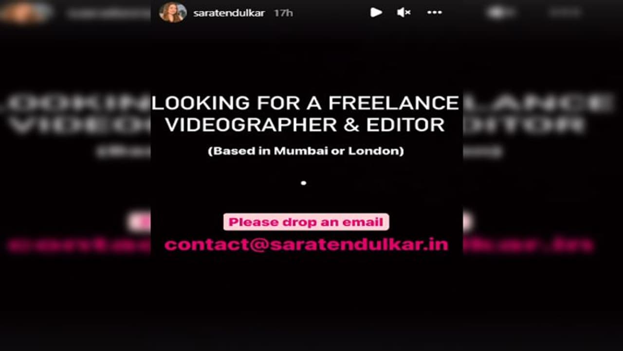 दरअसल, सारा तेंदुलकर को एक फ्रीलांसर वीडियोग्राफर और एडिटर की तलाश है, जो भी इस जॉब के इच्छुक हैं वह सारा तेंदुलकर की ईमेल आईडी contact@saratendulkar.in पर अपनी डिटेल भेज सकते हैं। इसकी जॉब लोकेशन मुंबई या लंदन होगी। ऐसे में इच्छुक उम्मीदवार जल्द ही अपने रिज्यूमे सारा की ईमेल आईडी पर भेज सकते हैं।