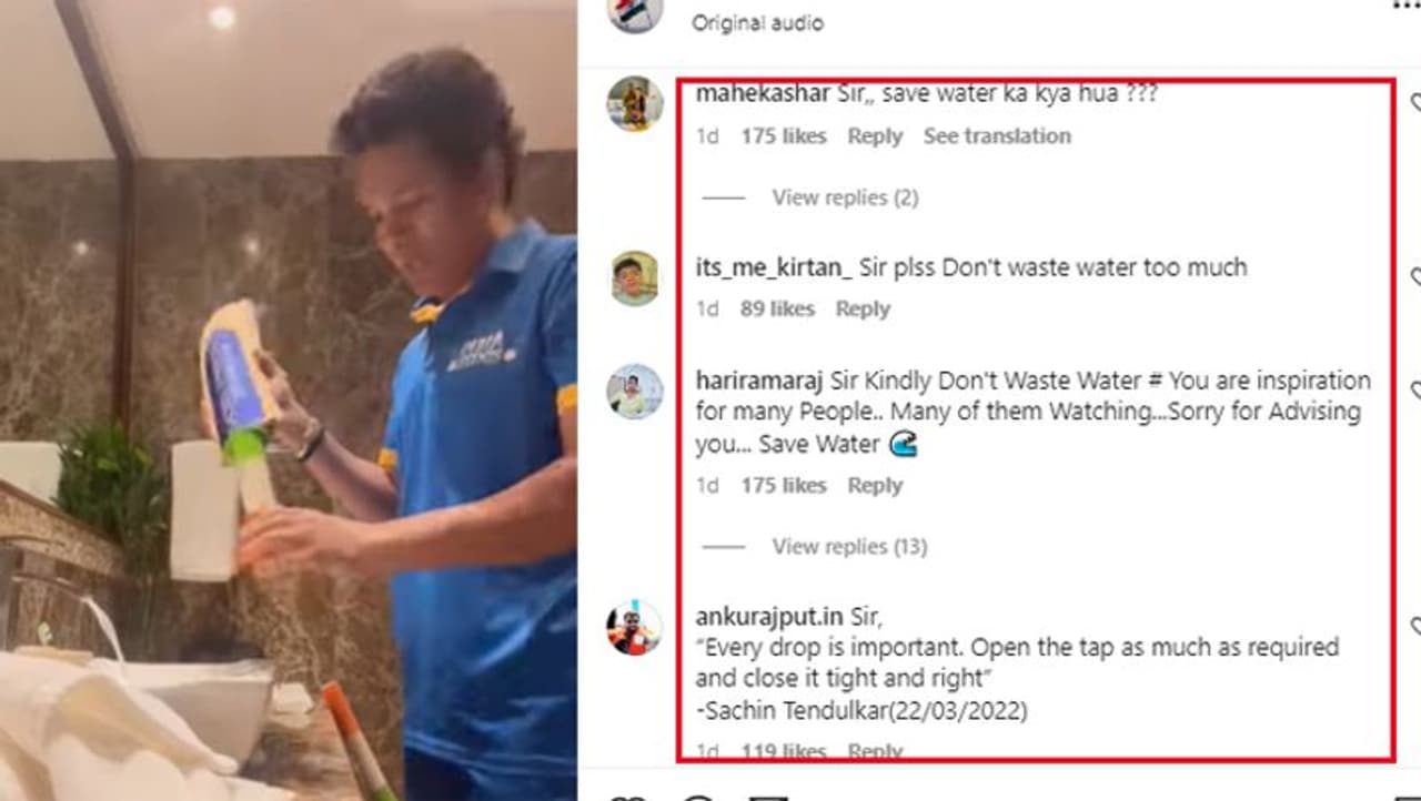 सचिन तेंदुलकर ने हाल ही में अपनी इंस्टाग्राम अकाउंट पर एक वीडियो शेयर किया और इसे कैप्शन दिया- 'बैट और संगीत का कॉन्बो पूरी जिंदगी के लिए है। बेड की ग्रिप को साफ करने का मेरा स्पेशल तरीका...' इस वीडियो में आप देख सकते हैं कि सचिन तेंदुलकर होटल रूम के बाथरूम में मौजूद हैं और वहां सिंक के पास खड़े होकर अपना बैट साफ कर रहे हैं। इसके बैकग्राउंड में बॉलीवुड सॉन्ग 'कोई रोको ना' बज रहा है। इस दौरान वह सावधानी से बैठ की ग्रिप धोने की सलाह दे रहे हैं, ताकि बाट गीला ना हो जाए। लेकिन इस वीडियो में सचिन पूरे समय पानी का नल चालू छोड़ देते हैं और इसमें से काफी ज्यादा पानी बह रहा है। यह देखकर सोशल मीडिया यूजर्स भड़क उठे और उन्हें ट्रोल करने लगे।