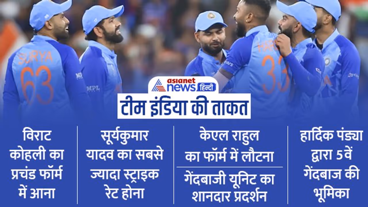 टी20 विश्वककप में भारतीय टीम की बात करें सुपर-12 के 5 मैचों में 4 जीतने वाली यह इकलौती टीम है औस सबसे ज्यादा 8 अंकों के साथ सेमीफाइनल में पहुंची है। टीम की बल्लेबाजी शानदार हो रही है और विराट कोहली-सूर्यकुमार यादव टॉप फॉर्म में हैं। इसके साथ ही भारतीय टीम की गेंदबाजी भी पिछले कुछ महीनों के मुकाबले बेहतर है।