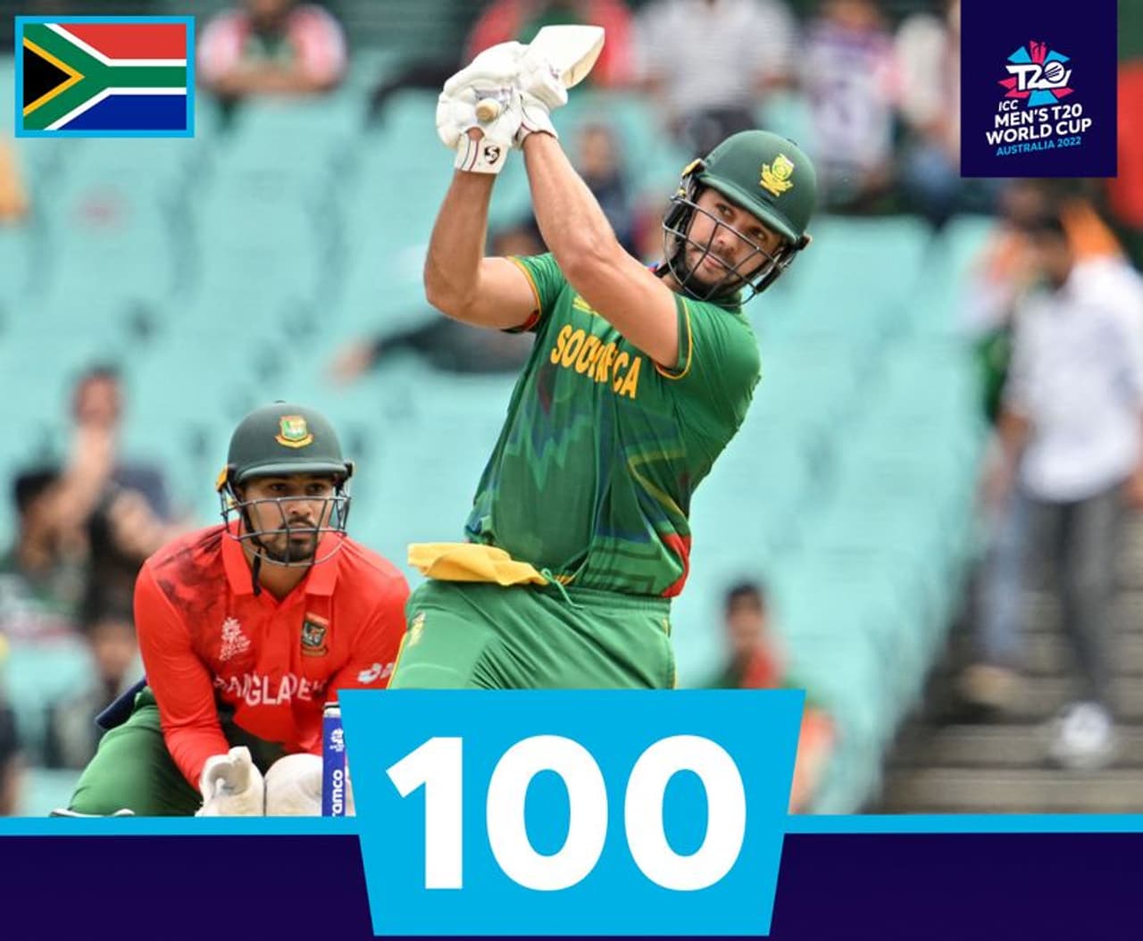 टी20 विश्वकप 2022 की पहली सेंचुरी साउथ अफ्रीकी बल्लेबाज रीले रूसो के नाम हो गई है। बांग्लादेश के खिलाफ मैच में रूसो ने सिर्फ 56 गेंद पर 109 रन बना डाले हैं। इस पारी में रूसो ने 7 चौके और 8 गगनचुंबी छक्के जड़े हैं। वर्तमान टी20 विश्वकप का यह पहला शतक है।