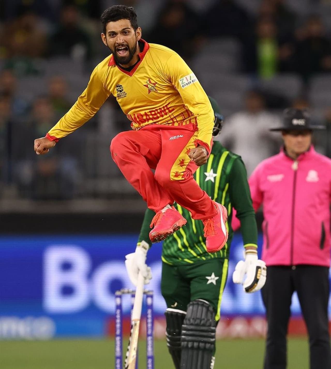 जिम्बाबवे के ऑलराउंडर सिकंदर रजा जब विकेट लेते हैं तो हाई जंपर के स्टाइल में शानदार सेलिब्रेट करते हैं। पाकिस्तान के खिलाफ तो सिंकदर रजा को देखकर फैंस ने कहा कि यह तो किसी जंपिंग जैक की तरह लग रहे हैं। सिकंदर रजा इस विश्वकप में शानदार फॉर्म में हैं। उन्होंने न सिर्फ गेंदबाजी में बल्कि बल्लेबाजी में भी कमाल का प्रदर्शन किया है। सिकंदर रजा दुनिया के बेहतरीन ऑलराउंडर में से एक हैं।