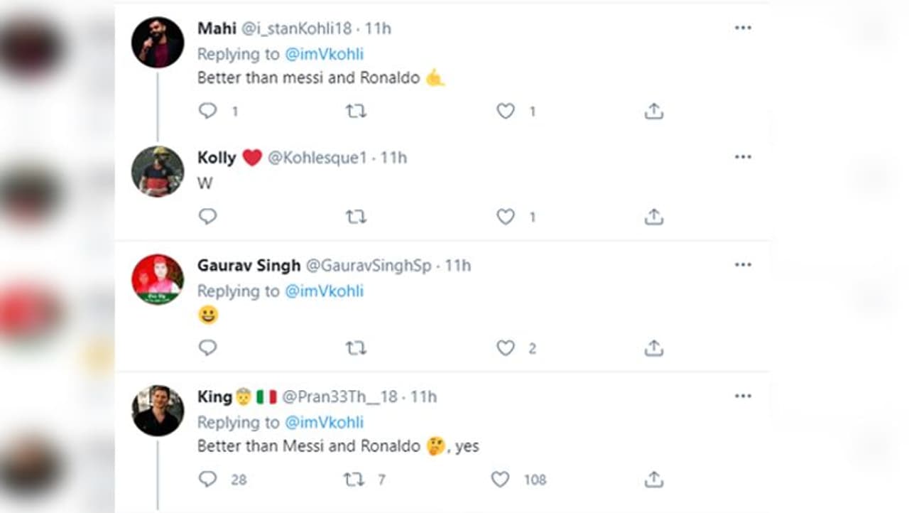 विराट कोहली को ये वीडियो सोशल मीडिया पर कुछ ही देर में वायरल हो गया। 12 घंटे में 85 हजार से ज्यादा लोग इसे लाइक कर चुके हैं। वहीं, 6 हजार से ज्यादा यूजर्स ने रीट्वीट किया। एक फैन ने लिखा कि- 'मेसी-रोनाल्डो को पीछे छोड़ दिया', तो एक ने रिप्लाई किया की 'मुंह की बात छीन ली।'