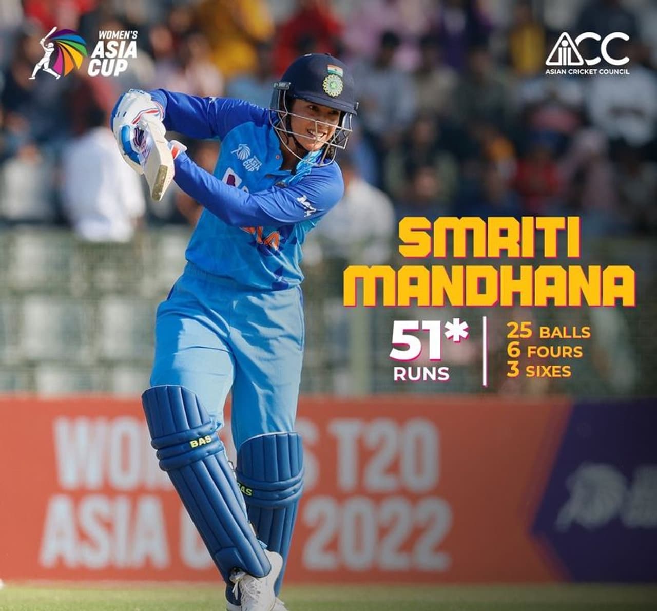 वुमेंस एशिया कप के फाइनल मुकाबले में श्रीलंकाई टीम ने पहले टॉस जीतकर बैटिंग शुरू की। शुरूआती झटके लगने के बाद टीम इससे उबर नहीं पाई और 20 ओवर में 9 विकेट खोकर सिर्फ 65 रन ही बना सकी। जवाब में उतरी भारतीय महिला टीम की ओपनर स्मृति मंधाना ने पहली गेंद से ही प्रहार करना शुरू किया और अंत में लाजवाब छक्का मारकर फाइनल मुकाबला जीता। ओपनर मंधाना ने सिर्फ 25 गेंद पर 6 चौके और 3 छक्कों की मदद से 51 रनों की पारी खेली। वहीं शेफाली वर्मा ने 5 रन बनाए। जेमिमा रोड्रिग्ज इस मैच में नहीं चल पाईं और सिर्फ 2 रन बनाकर आउट हो गईं। कप्तान हरमनप्रीत कौर ने नाबाद रहते हुए 11 रनों की पारी खेली और भारत ने 8 विकेट से शानदार जीत दर्ज की। भारतीय टीम में 8.3 ओवर में ही यह रन बनाए।