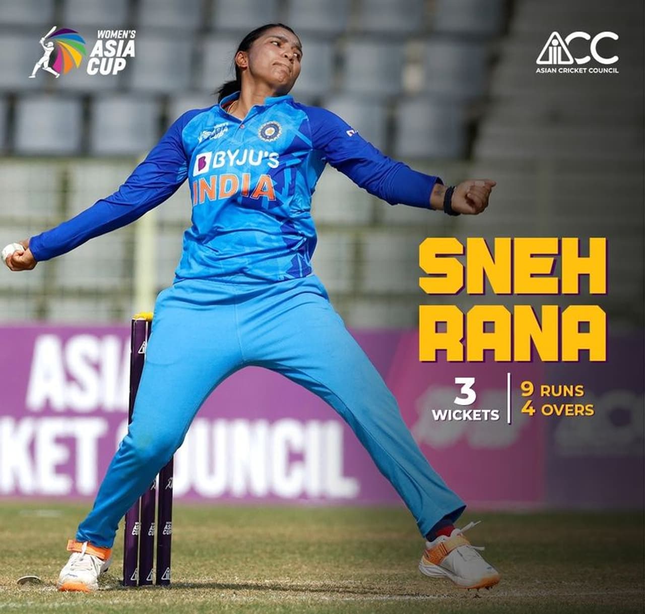 Women's Asia Cup Cricket. वुमेंस एशिया कप क्रिकेट टूर्नामेंट में भारतीय महिलाओं का शानदार प्रदर्शन जारी है। भारतीय महिला क्रिकेट टीम की कप्तान स्मृति मंधाना ने टॉस जीता और थाइलैंड के खिलाफ पहले गेंदबाजी करने का निर्णय लिया। भारतीय खिलाड़ियों ने शानदार गेंदबाजी और उम्दा फील्डिंग के दम पर थाइलैंड को सिर्फ 37 रनों पर ही ऑलआउट कर दिया। इसके बाद बैटिंग करते हुए सिर्फ 1 विकेट खोकर जीत के लिए जरूरी रन बना लिए। अब तक खेले गए एशिया कप टूर्नामेंट में यह भारत की सबसे बड़ी जीत है।